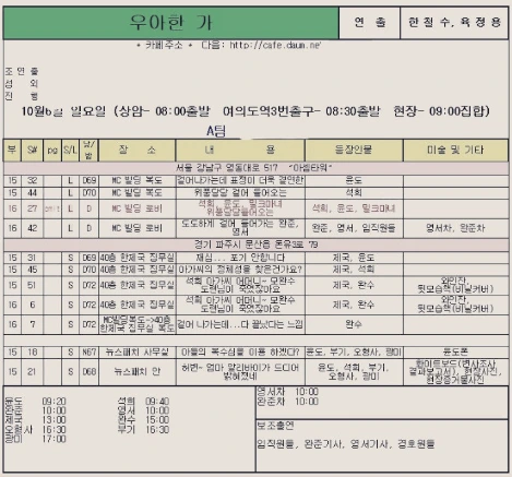 그래서 현장에 있는 스태프들은 이 스케줄표를 통해 오늘 어떻게 촬영이 진행될 것인지 파악할 수 있고,