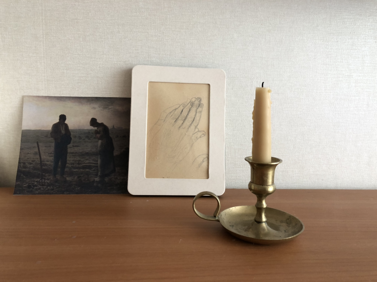 조용하게 힘을 얻고 싶은 날이면 곁에 초 하나 켜고 프린트 해 둔 <만종>을 본다. 먹고사는 고단함이 체력을 덮쳐 웬만한 정신력 가지고는 회복이 안 될 땐 마음을 쉬게 하는 수밖에 없다. 부족하면 부족한 대로 감사를 표하는 사진 속 젊은 부부에 시선이 닿으면 아무 생각 없이 마음이 누그러진다. 하루하루 고비 사막을 넘듯 감정에 휘둘려도, 일단 내 공간에 오면 무사히 하루를 보냈다는 안도감과 감사함을 전하게 된다. 때론 절실하게 느끼는 삶의 경건함을 고백하기에도 좋은 초 아래.