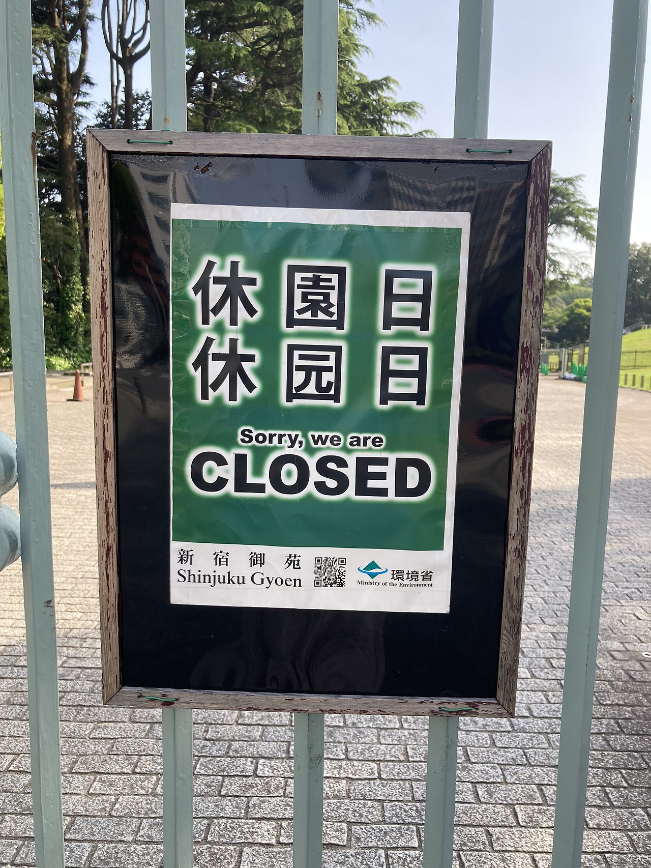 입구 쪽에 도착하니까 신주쿠 공원 휴관일이라고 팻말이 붙어있는 것이었다.