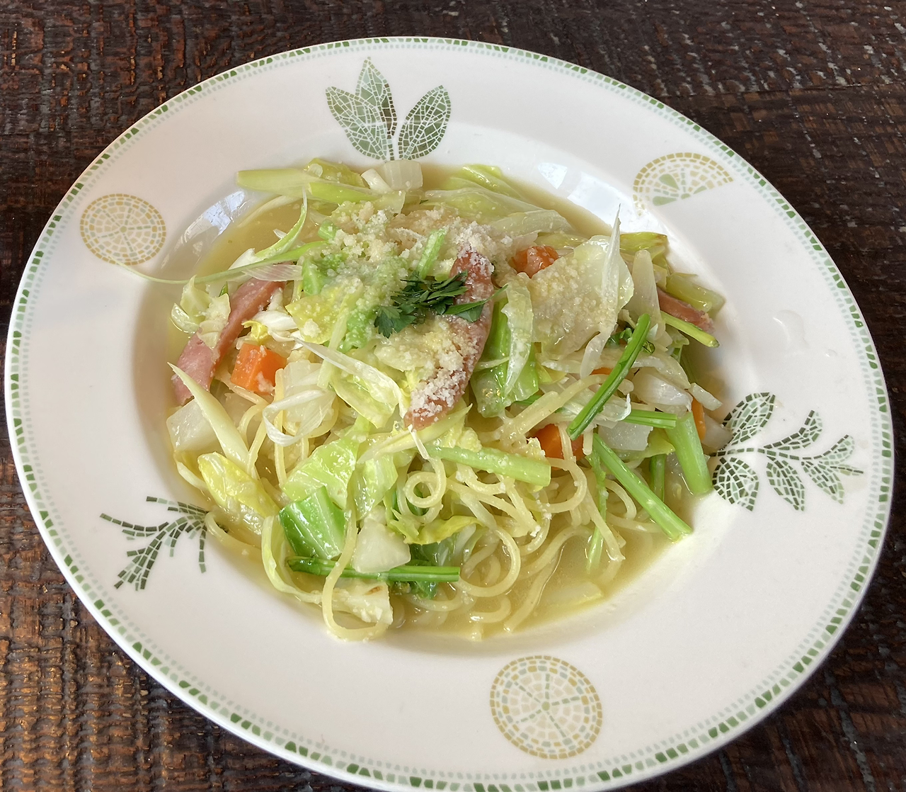 오늘의 추천 메뉴는 미니 샐러드, 음료, 소시지와 야채가 들어간 일본풍 소스의 파스타 이렇게 세트로 팔고 있어서 주문했다.