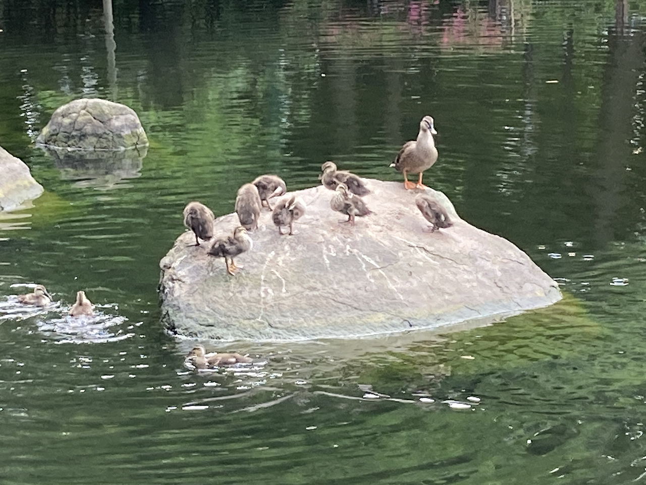 무슨 일인가 하면서 봤더니 연못에 솟아 나온 큰 돌멩이에 오리가족이 일광욕(?)을 하고 있었다.