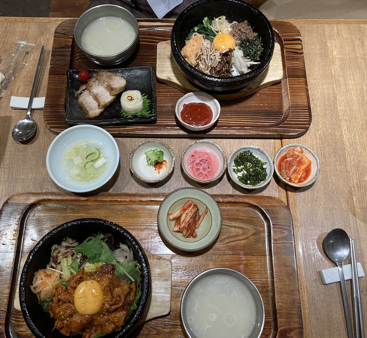 신랑은 보쌈 돌솥비빔밥 세트, 나는 돼지고기가 들어있는 비빔밥 세트를 먹었다.