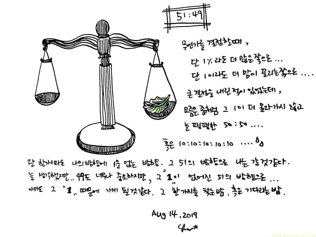 저울에 나뭇잎 하나만 올려져도 그 쪽으로 저울이 기울게 되는 것 처럼, 저의 마음은 어느 한쪽에 1을 더했습니다. 그래서 그 쪽을 선택할 수 밖에 없었습니다.
