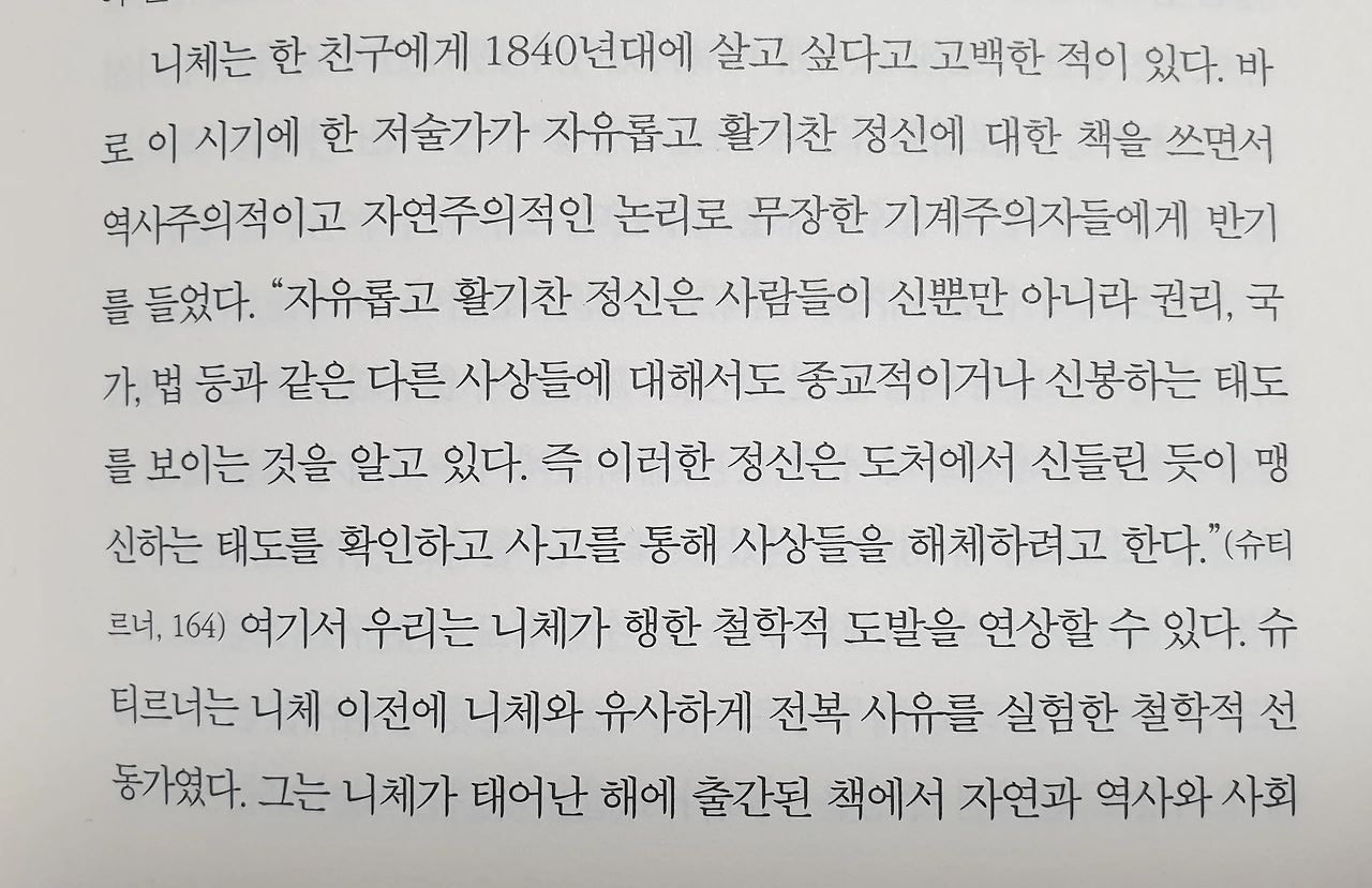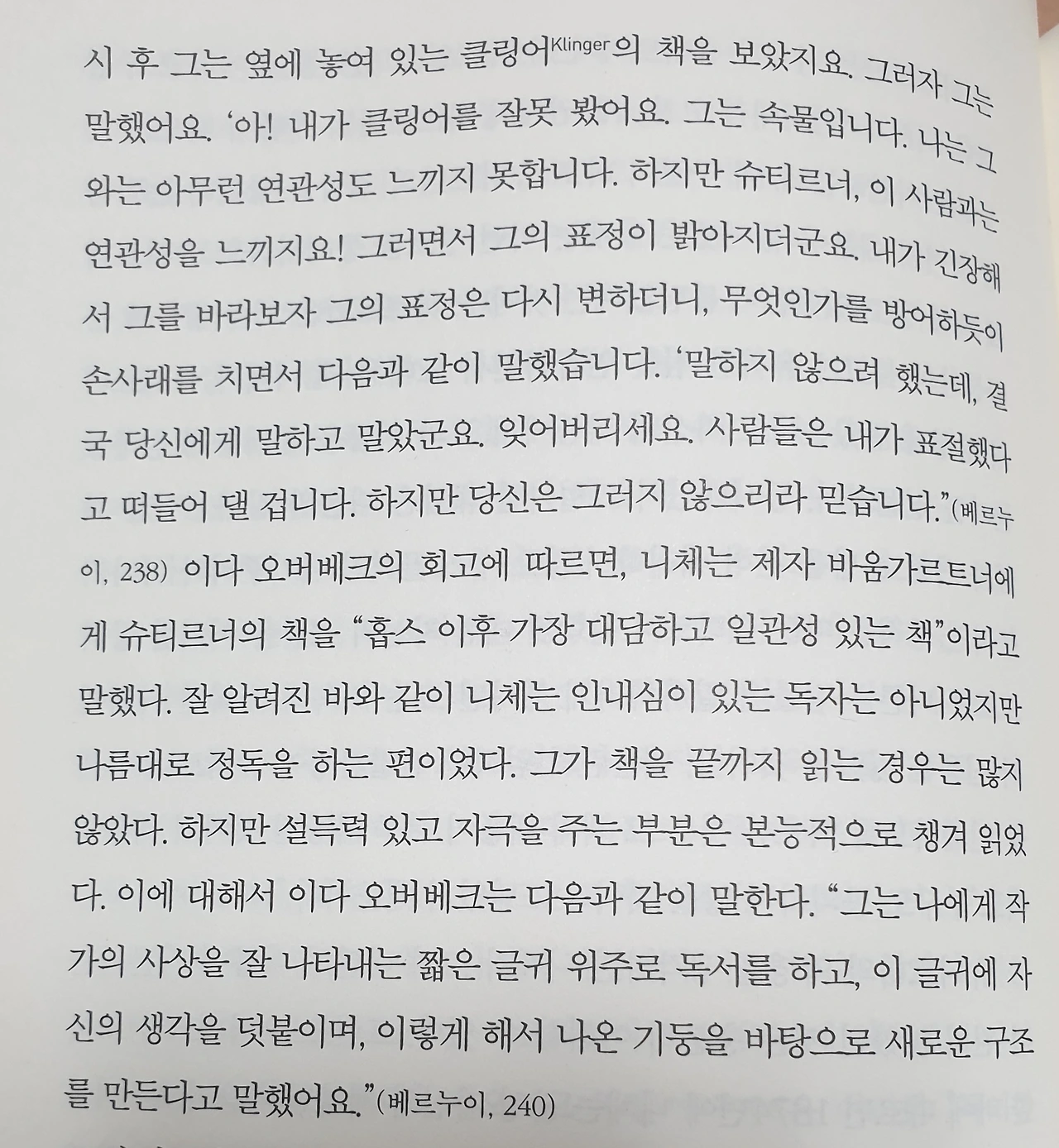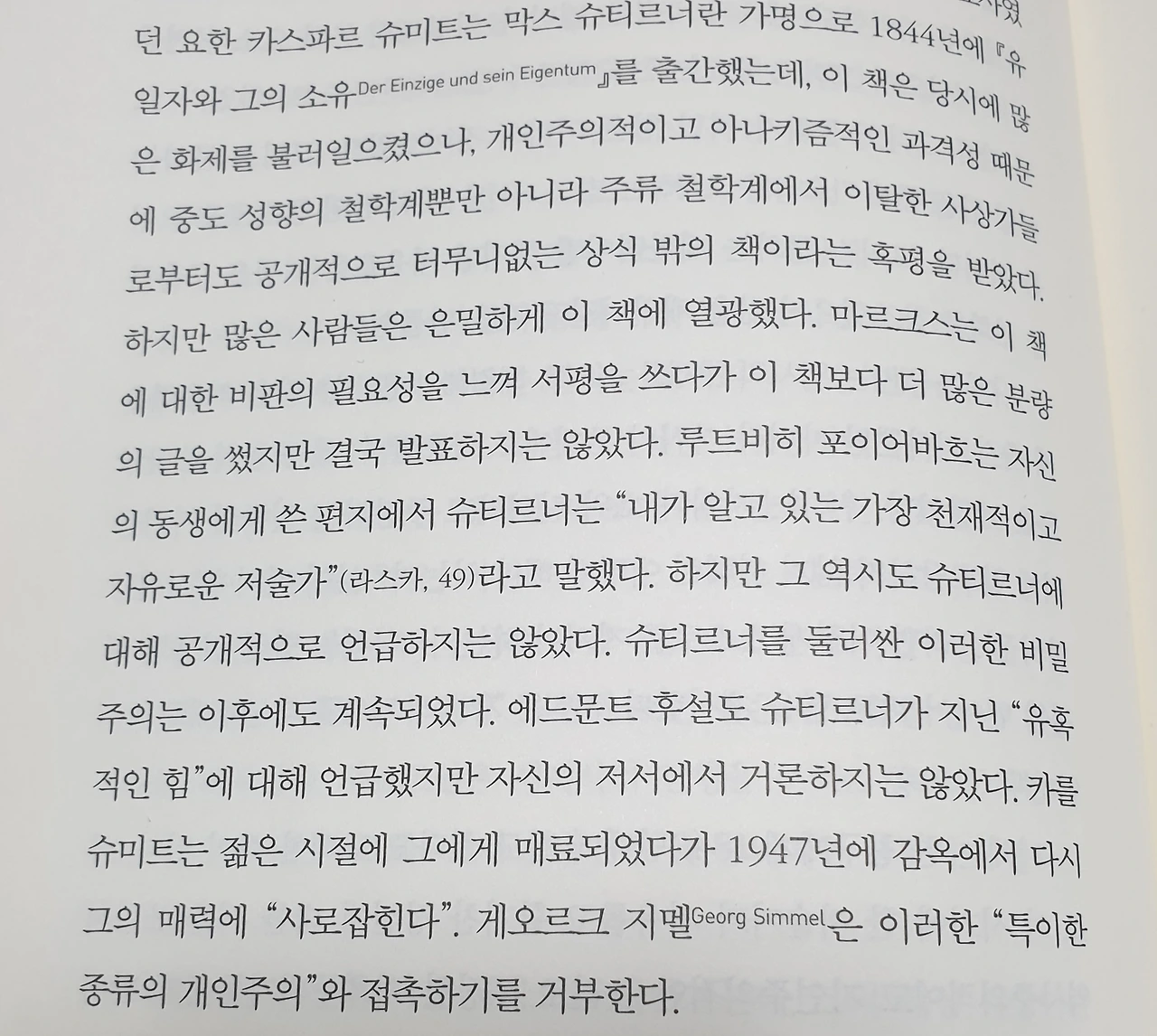 2023년 02월 28일 부로 번역서가 출간되었다는 놀라운 소식을 접했다. 이번 학기 <번역철학> 과제 정도로 뚝딱 넘기고 책장에서 2군 노릇이나 시키려 했던 슈티르너가 1군 주장 완장을 꿰차는 순간이었다. 나는 요즘 심히 불안해서 운명론적으로 사고해 보곤 하는데, 지금 모든 운명이 나를 슈티르너로 이끌고 있다. 분명 나는 지난 12월 즈음 슈티르너를 대충 보다가 말았고, 우연히 이번에 학회를 들어갔더니 니체를 읽게 되었고, 우연히 학회에서 슈티르너 이야기를 꺼내볼 기회가 있었고, 우연히 때마침 <번역 철학> 발표 과제를 슈티르너로 할 마음을 먹고 있었으니까. 이러니 이 학자를 정독하지 않을 수가 없다(라고 변명하면서 정독할 예정이다).