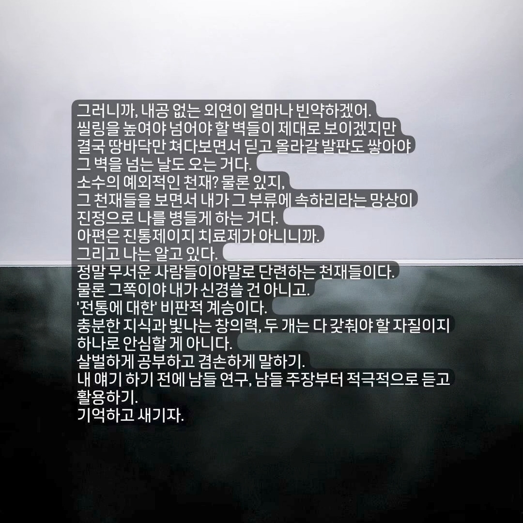 그런데 결국 쓰고 말해야 한다고 생각은 들어요. 내 걸로 만들기 위해서 내가 어떤 입장에 빙의를 해보거나, 내 주장을 만들어서 설명해 봐야 공부가 완성되는 것 같아요. 그런 자리를 종종 만들어야죠. 스터디를 한다거나, 학회를 한다거나, 어디서 발표를 해본다거나.