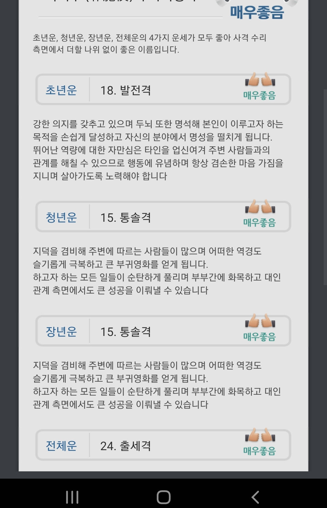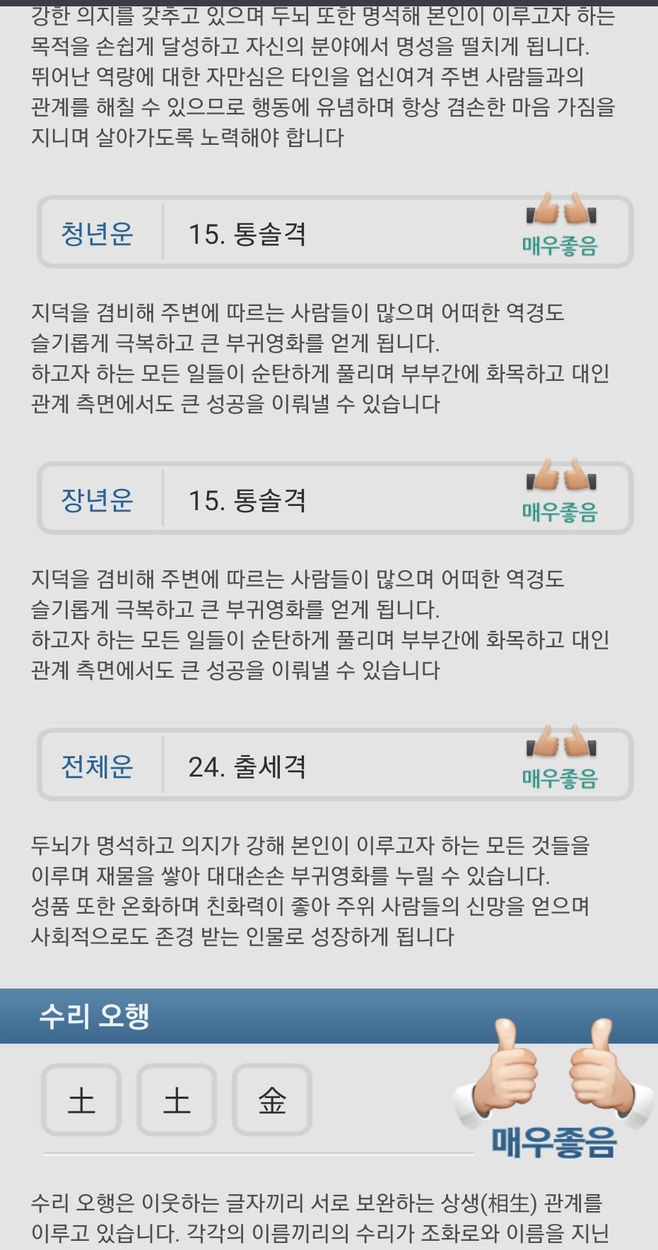 조리원 침대에 누워서 나는 내가 지은 이름에 가능한 모든 한자를 전부 다 대입시켜서 쌩노가다로 좋은 사주를 찾아냈다. 이름에 가능한 한자 하나하나를 전부 다 입력란에 넣고 프로그램을 돌렸더니, 찾고 찾아서 마침내 결국 모든 요소(발음 오행, 발음 음양, 사격 수리, 초년운, 청년운, 장년운, 전체운, 수리 오행, 수리 음양, 사주 오행)에서 ‘매우 좋음’이라고 뜨는 이름을 찾을 수 있었다.