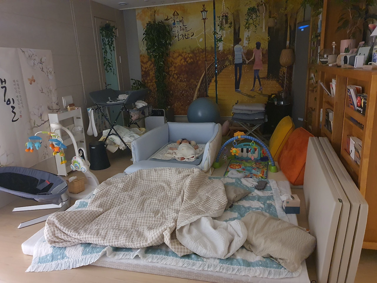 점차 당근마켓에 내가 아끼던 식물 화분들을 하나 둘씩 처분하고, 거실 가운데를 차지하던 카페에서나 쓸 법한 예쁘고 큰 우드슬랩 테이블도 치우고 그 자리에는 유아용 매트가 넓찍하게 깔리고 그 위에는 아기 체육관, 바운서, 아기 장난감 등 아기 용품들로 가득 차게 되었다.