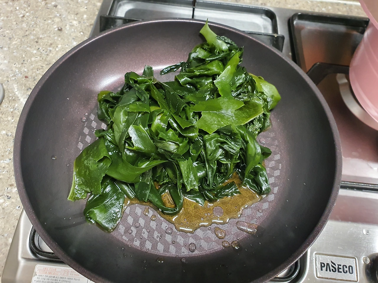 8. 그동안 불려 놓은 미역을 건져서 후라이팬에 들기름 또는 참기름을 두르고 달달 볶는다.