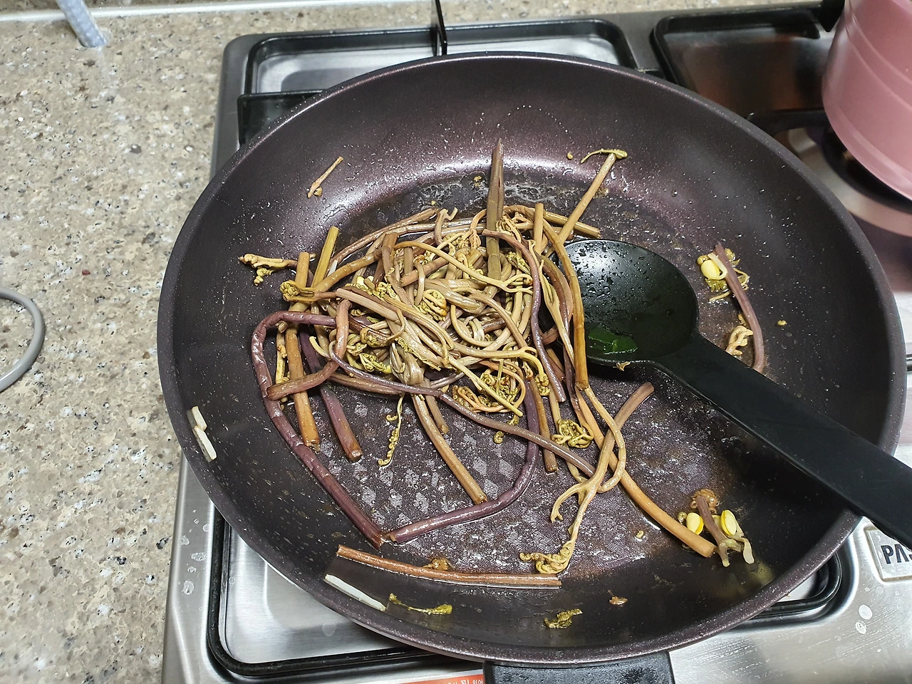 7. 물에 10분 정도 불려 놓은 고사리를 건져서 후라이팬에 들기름 또는 참기름을 두르고 달달 볶는다. 국간장도 넣으면서 볶는다. (역시 간은 보지 않는다.)