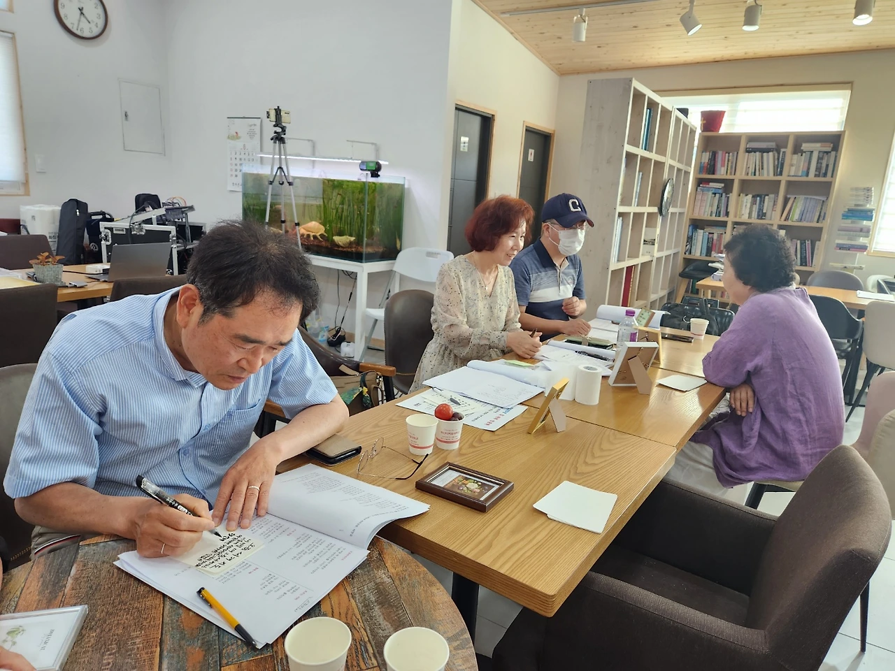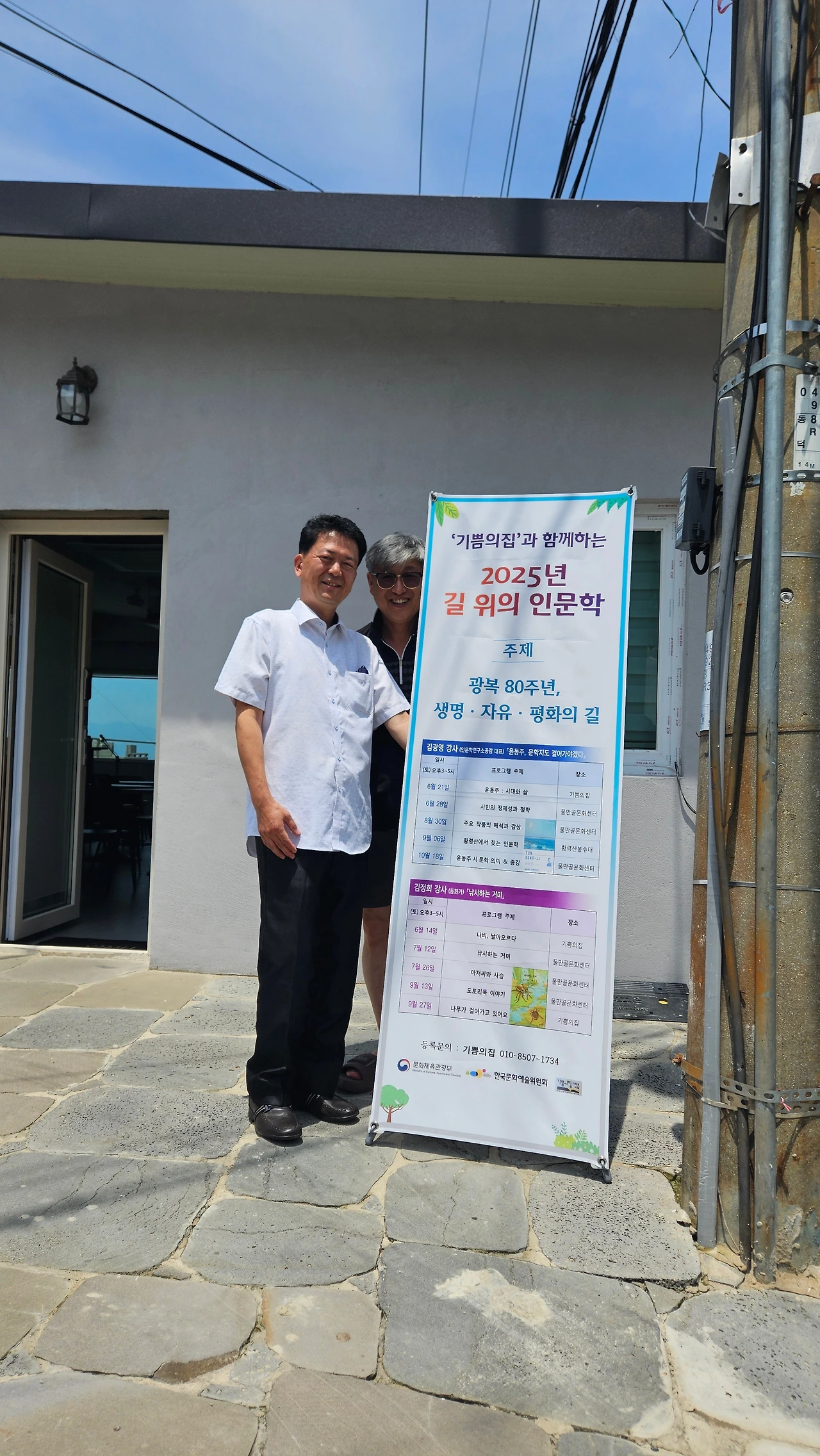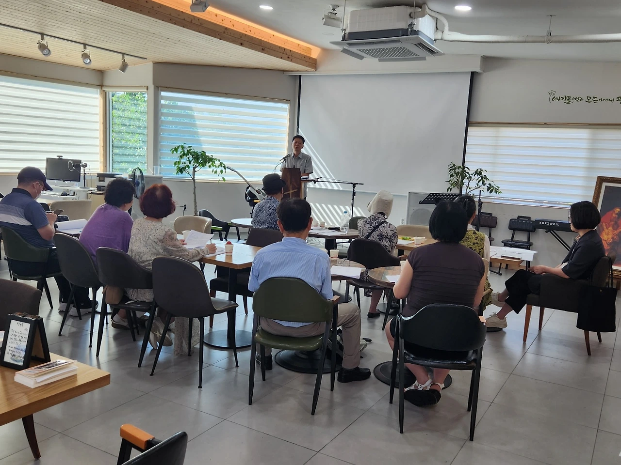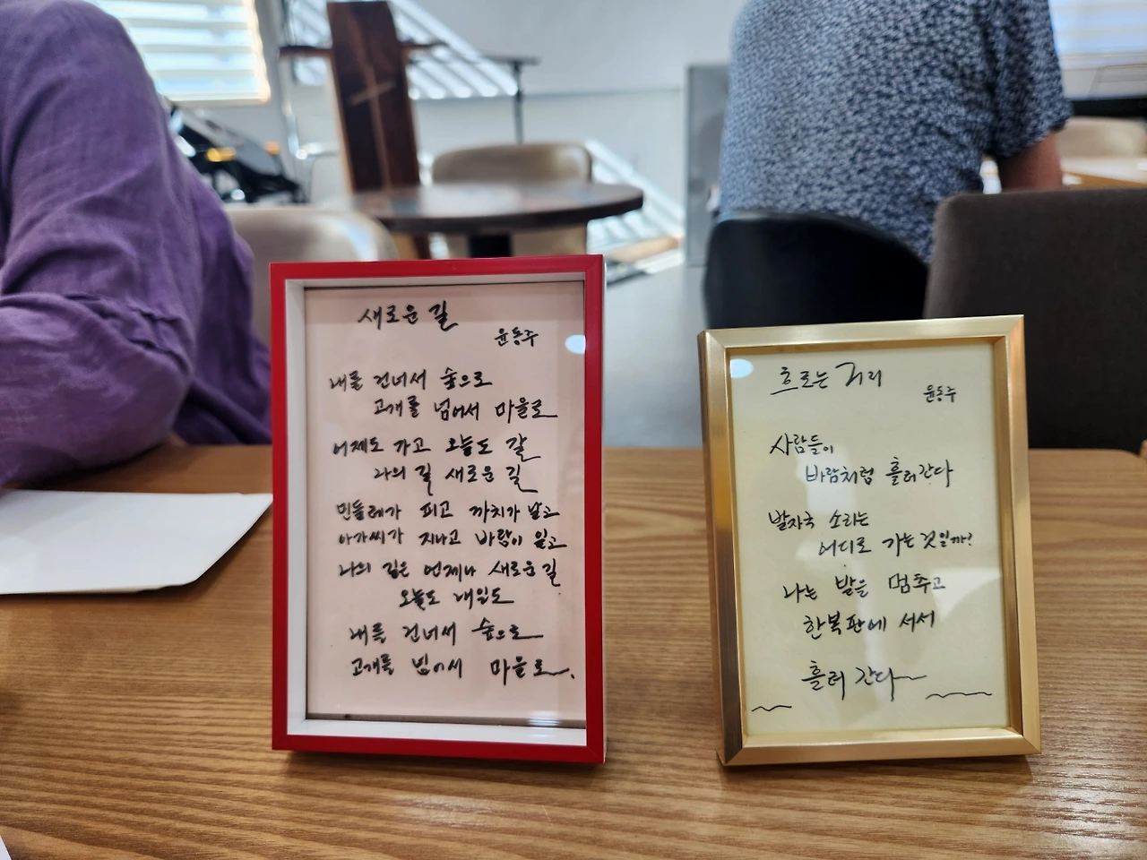 액자에 새긴 싯귀를 발표하며 광복 80주년 그 가치를 잠시 멈추어 느껴본다. '윤동주 시세계를 걷다' 2번째 시간. 장소를 도심 한복판 기쁨의 집에서 도심 속 오지 물만골로 옮겨왔다. 하지만 폭염을 뚫고 시에 대한 사랑으로 이웃과 세계를 품고자 하는 강한 의지를 벗님들로부터 느낀다.