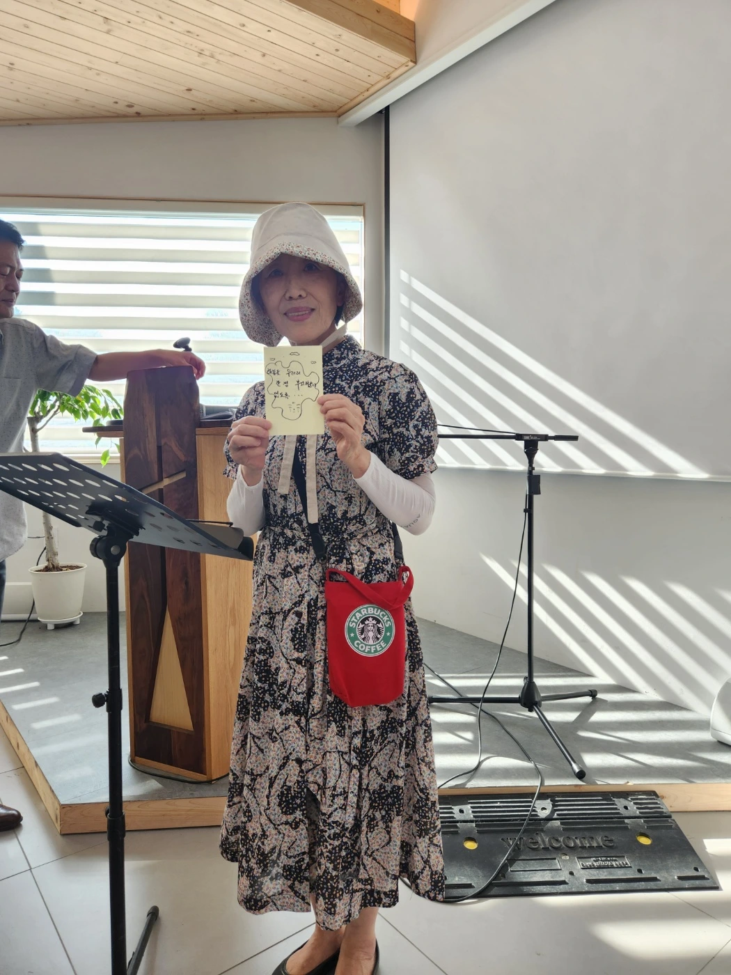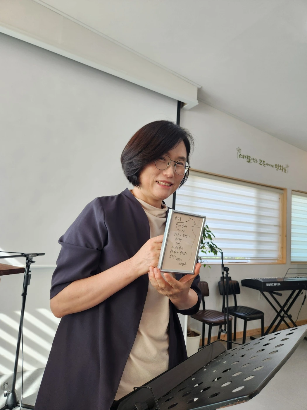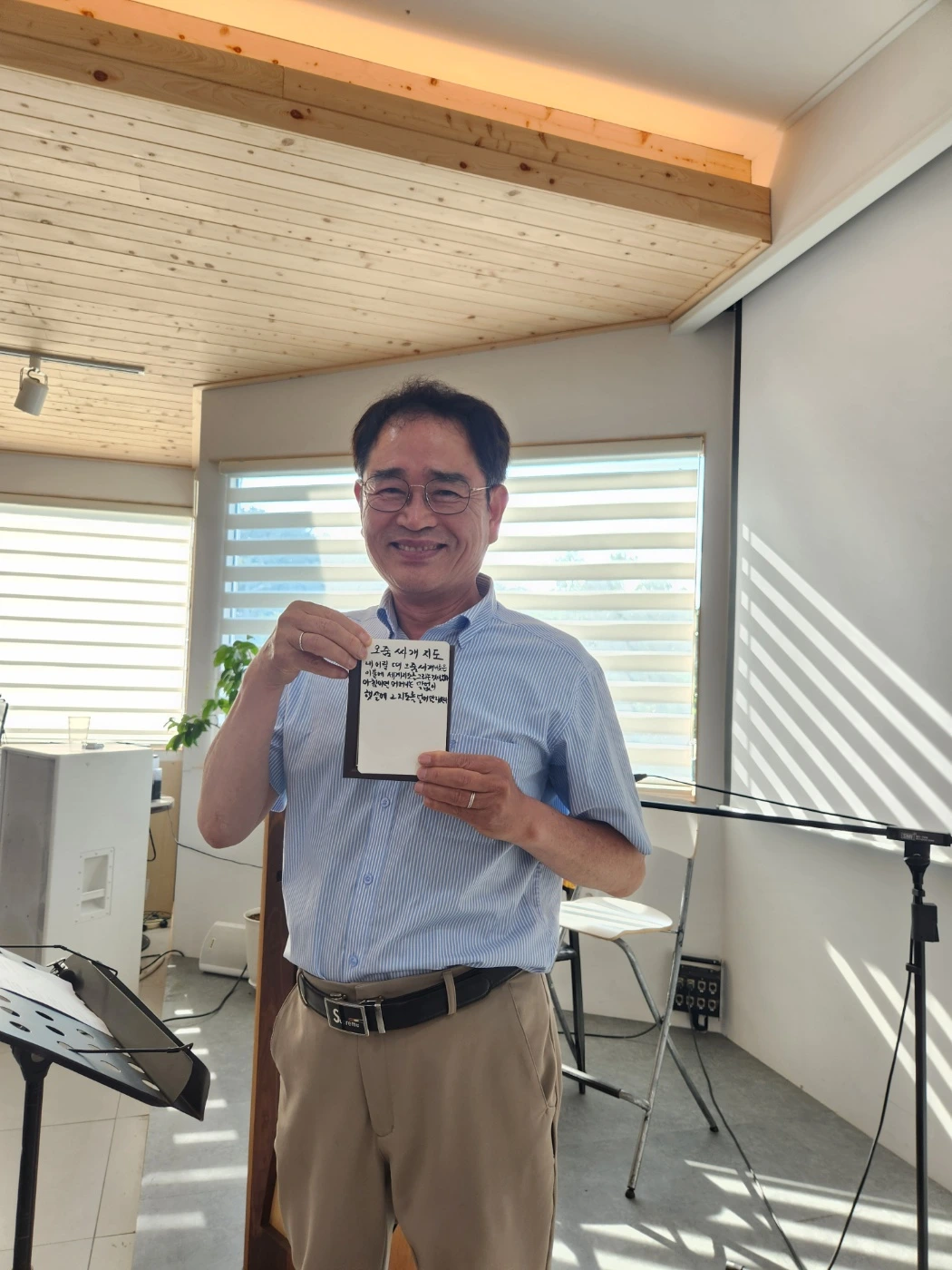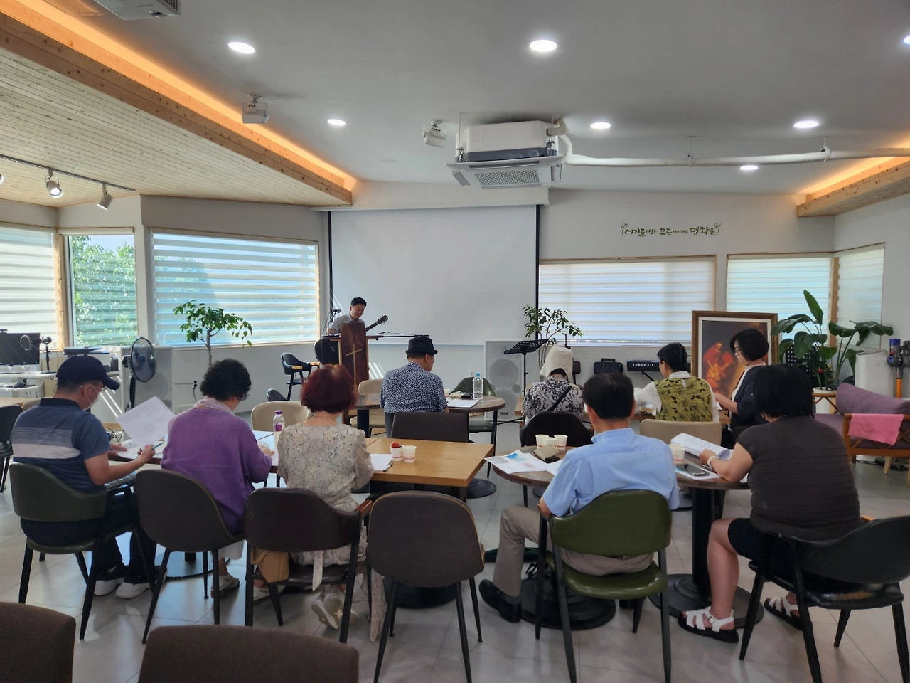 액자에 새긴 싯귀를 발표하며 광복 80주년 그 가치를 잠시 멈추어 느껴본다. '윤동주 시세계를 걷다' 2번째 시간. 장소를 도심 한복판 기쁨의 집에서 도심 속 오지 물만골로 옮겨왔다. 하지만 폭염을 뚫고 시에 대한 사랑으로 이웃과 세계를 품고자 하는 강한 의지를 벗님들로부터 느낀다.