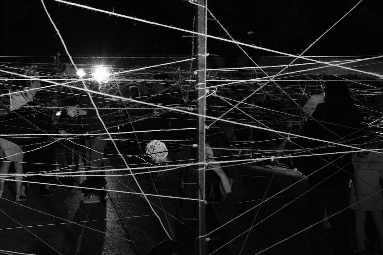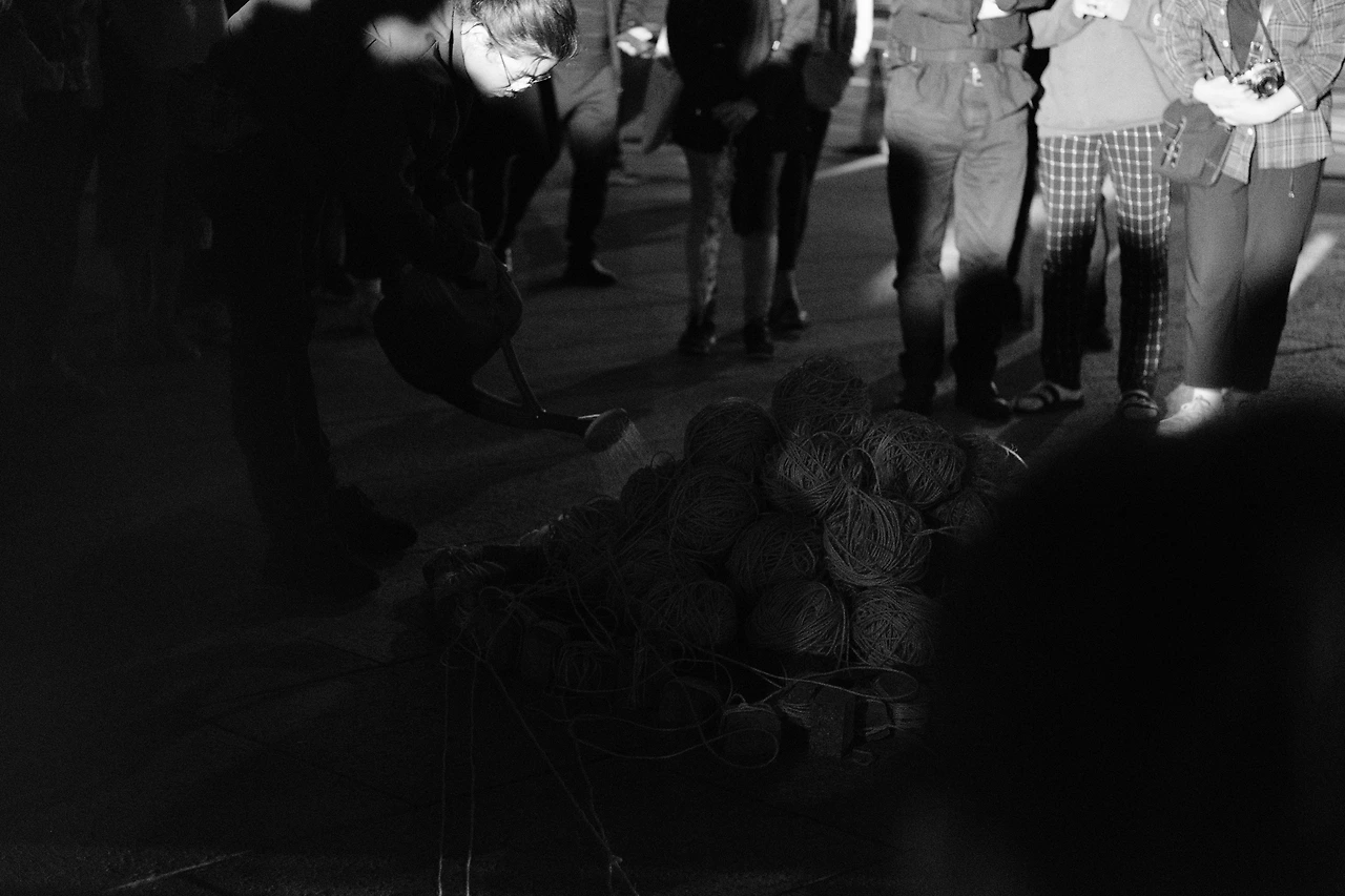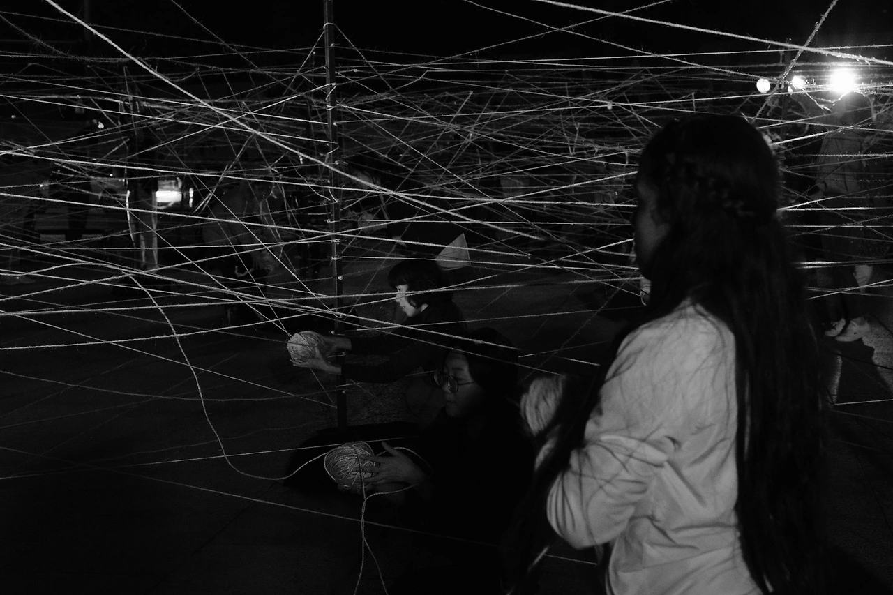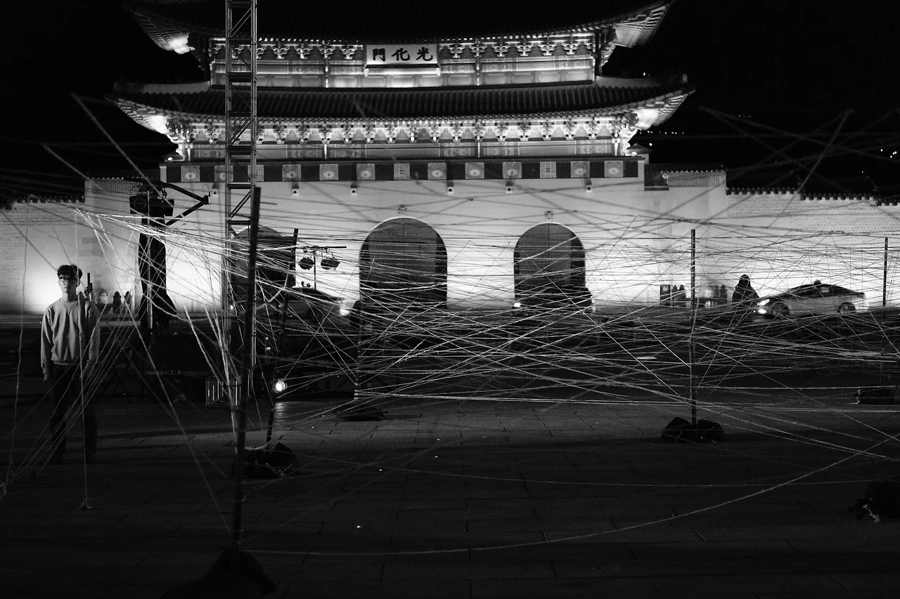시민들이 모두 참여하는 공연이었으며, 사람키높이의 기둥들과 그 사이들을 촘촘히 엮여 있는 실들, 사람들은 그 사이를 비집고 들어가서 실들을 풀며, 조그맣게 그리고 점점 더 큰 실뭉치를 만들기 시작했어요. 낮은 자세로 그 사이를 서로 마주치고, 지나가야 했고, 옆으로 같이 움직여야 했고, 어디로 이어졌는지 모를 실들을 풀며 손에 든 실뭉치를 점점 키우고 있었어요. 한참의 시간이 흘렀어요. 사람들의 표정들은 재밌음에서 자뭇 진지해지기 시작했어요. 자유로운 공간이 넓어지며, 꼬마아이들은 그 안에서 뛰어놀기 시작을 했던 것 같아요. 역시나 그 후로도 시간은 한참 흘렀어요. 어두운 공간 부족한 빛에 의지해 사람들은 알지 못할 그것을 끝까지 해냈습니다. 그리고 그들은 실뭉치를 들고 한 곳으로 모였고, 실뭉치는 또 한 곳으로 쌓였어요. 그리고는 불에 태웠습니다. 어두운 도시의 광화문 앞에서 영문모를 실들의 뭉치들은 활활 타올랐어요. 작은 불였지만, 아주 밝았습니다.