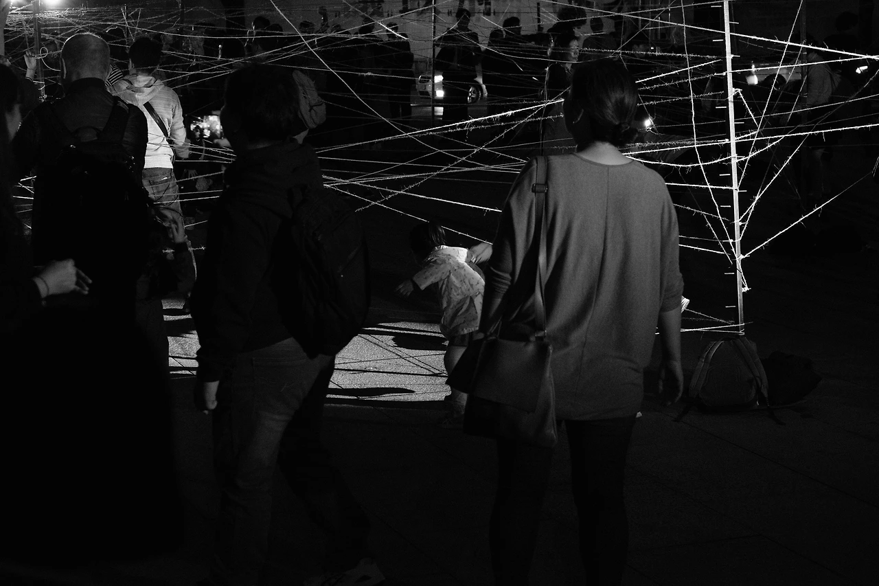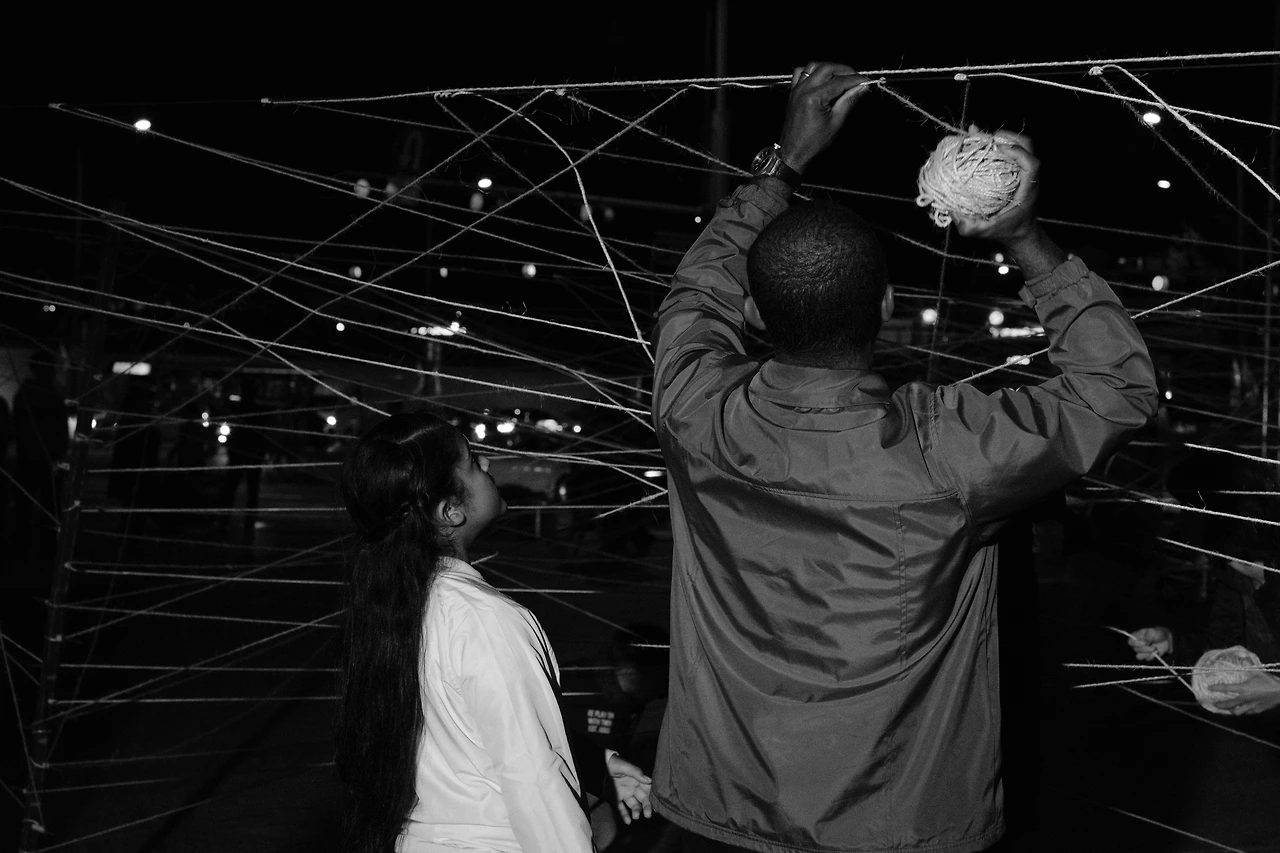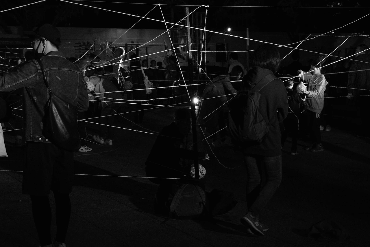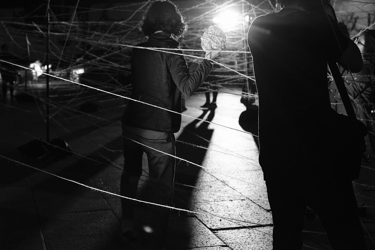 시민들이 모두 참여하는 공연이었으며, 사람키높이의 기둥들과 그 사이들을 촘촘히 엮여 있는 실들, 사람들은 그 사이를 비집고 들어가서 실들을 풀며, 조그맣게 그리고 점점 더 큰 실뭉치를 만들기 시작했어요. 낮은 자세로 그 사이를 서로 마주치고, 지나가야 했고, 옆으로 같이 움직여야 했고, 어디로 이어졌는지 모를 실들을 풀며 손에 든 실뭉치를 점점 키우고 있었어요. 한참의 시간이 흘렀어요. 사람들의 표정들은 재밌음에서 자뭇 진지해지기 시작했어요. 자유로운 공간이 넓어지며, 꼬마아이들은 그 안에서 뛰어놀기 시작을 했던 것 같아요. 역시나 그 후로도 시간은 한참 흘렀어요. 어두운 공간 부족한 빛에 의지해 사람들은 알지 못할 그것을 끝까지 해냈습니다. 그리고 그들은 실뭉치를 들고 한 곳으로 모였고, 실뭉치는 또 한 곳으로 쌓였어요. 그리고는 불에 태웠습니다. 어두운 도시의 광화문 앞에서 영문모를 실들의 뭉치들은 활활 타올랐어요. 작은 불였지만, 아주 밝았습니다.