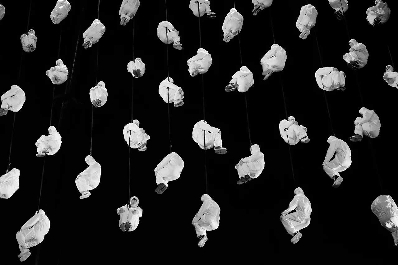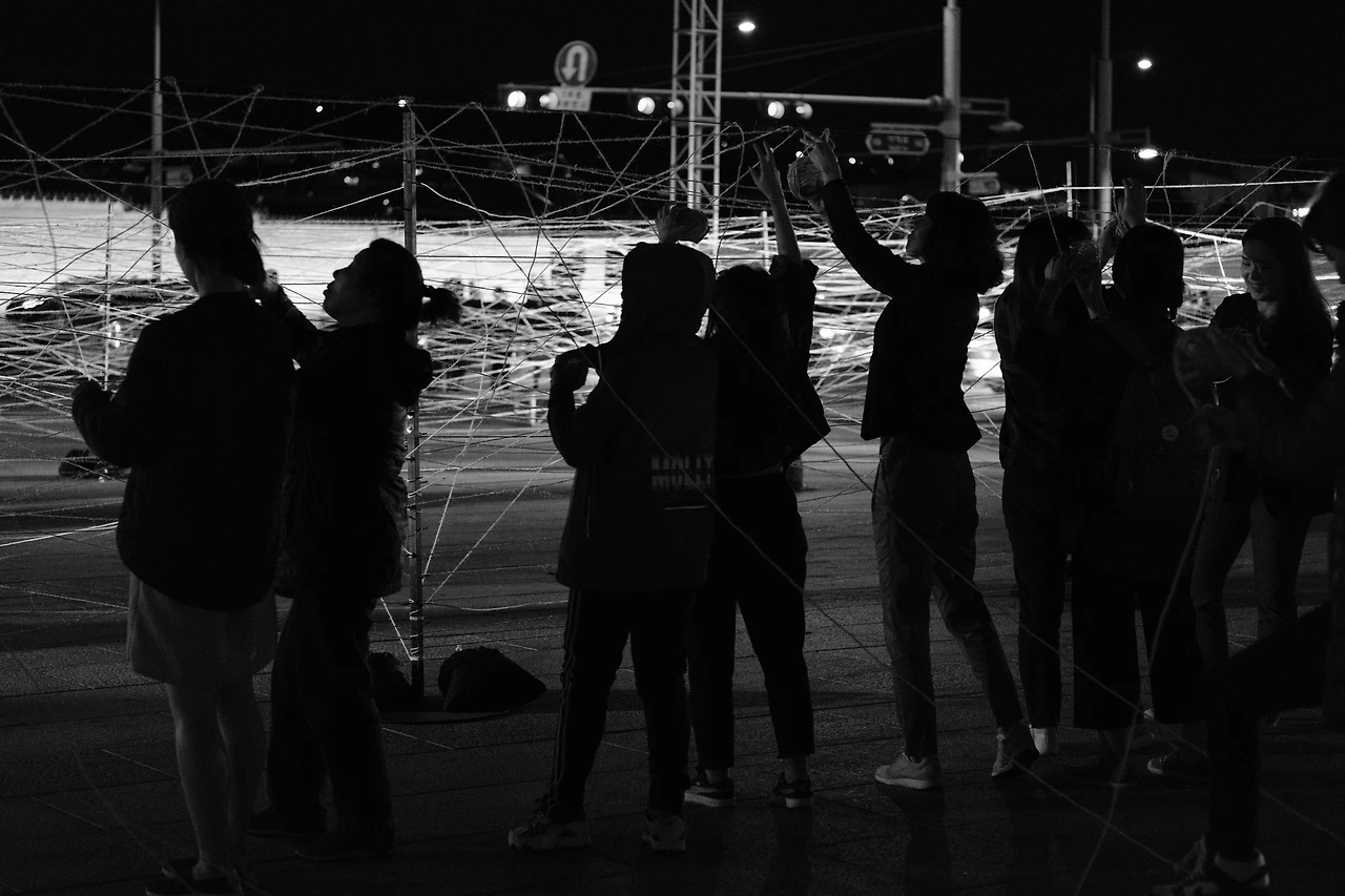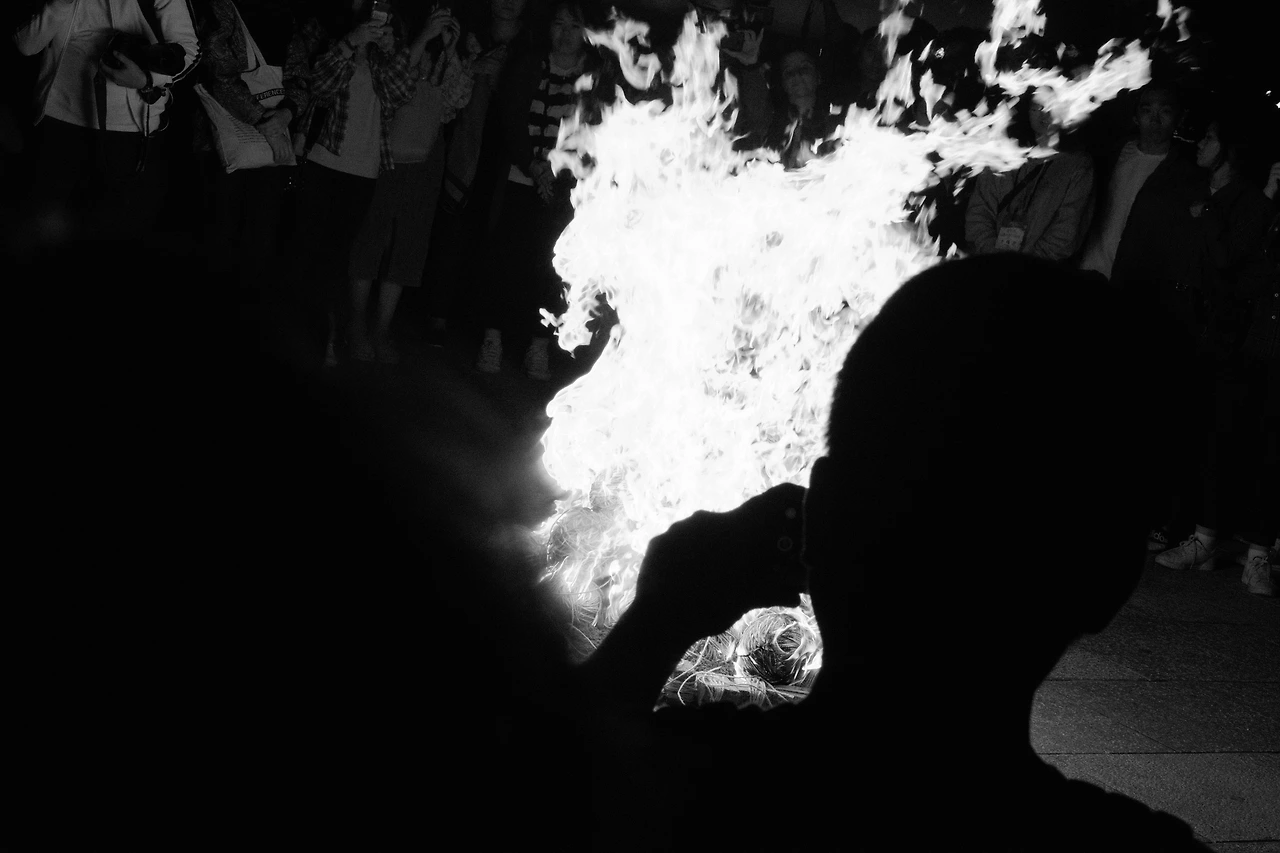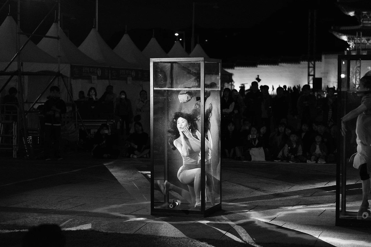 시민들이 모두 참여하는 공연이었으며, 사람키높이의 기둥들과 그 사이들을 촘촘히 엮여 있는 실들, 사람들은 그 사이를 비집고 들어가서 실들을 풀며, 조그맣게 그리고 점점 더 큰 실뭉치를 만들기 시작했어요. 낮은 자세로 그 사이를 서로 마주치고, 지나가야 했고, 옆으로 같이 움직여야 했고, 어디로 이어졌는지 모를 실들을 풀며 손에 든 실뭉치를 점점 키우고 있었어요. 한참의 시간이 흘렀어요. 사람들의 표정들은 재밌음에서 자뭇 진지해지기 시작했어요. 자유로운 공간이 넓어지며, 꼬마아이들은 그 안에서 뛰어놀기 시작을 했던 것 같아요. 역시나 그 후로도 시간은 한참 흘렀어요. 어두운 공간 부족한 빛에 의지해 사람들은 알지 못할 그것을 끝까지 해냈습니다. 그리고 그들은 실뭉치를 들고 한 곳으로 모였고, 실뭉치는 또 한 곳으로 쌓였어요. 그리고는 불에 태웠습니다. 어두운 도시의 광화문 앞에서 영문모를 실들의 뭉치들은 활활 타올랐어요. 작은 불였지만, 아주 밝았습니다.