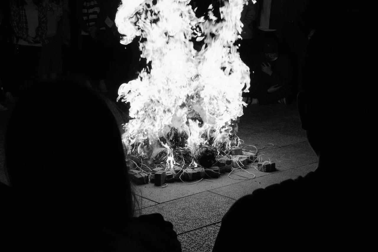 저마다 얽혔던 실들이 위로하지 않는 손으로, 굵직한 노동자의 손으로, 굽은 할머니의 손으로, 서투른 꼬마아이의 손으로, 한땀한땀 조심하며 기도하는 누군가의 손으로, 당차게 힘으로 끄는 손으로, 그렇게 다시 얽혀서 또다시 풀려야 하는 과정들을 거치며, 동글게 말려간 그 얽힘 덩어리는, 둘러앉은 사람들의 불멍의 시간을 이끌며 활활 타올랐다. 타들어가며 재를 남기는 시간들을 나는 사람들 바깥 언저리 어느 계단 위에서 꿈꾸듯 바라만 보았다.