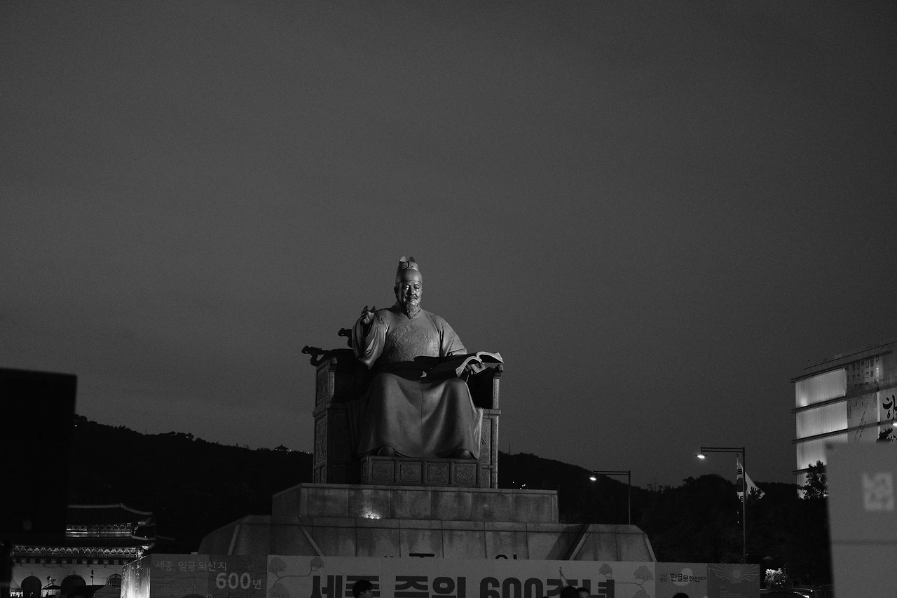 바람이 불고 찐한 밤이 찾아왔고, 대부분의 사람들은 갔지만 광화문 근처에서 하나의 공연이 남아 있습니다.