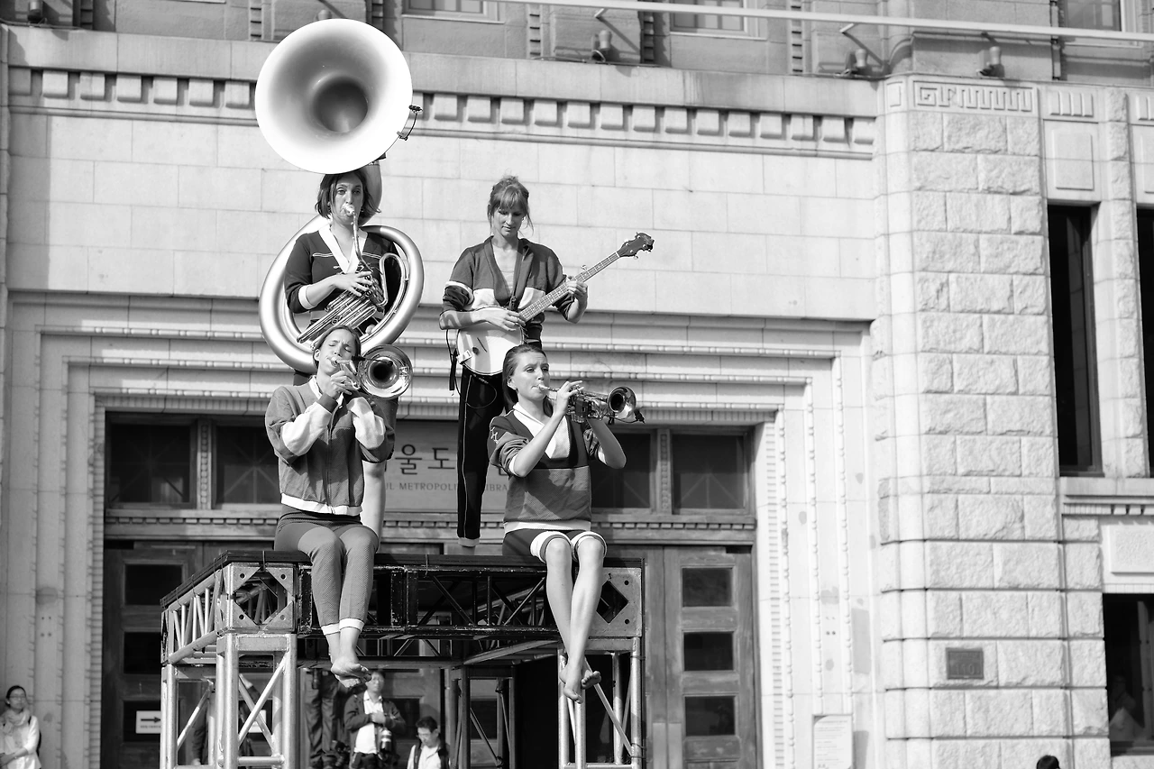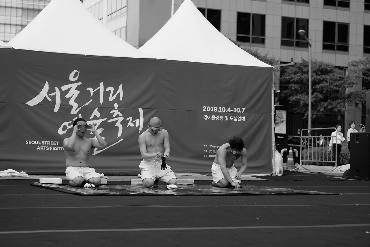 서울거리 예술축제에는 사람들이 참 많이 모여들었어요. 어떤 곳에서는 브라스 팀이 흥겹게 나발을 불며 사람들의 몸을 흐느적거리게 하고 있었고, 또 어떤 곳에 선 공중 묘기를 부리는 외국인 여성들의 아찔한 퍼포먼스에 저 멀리서 보며 기절할 듯 웃는 여자의 얼굴도 보였어요. 같은 유니폼을 입고 있는 젊은 남녀의 몰래 잡은 손이 아름다운 사랑의 온기를 뿜으며, 사람들의 더위를 식히고 있어요. 괘인 턱에서 잠에서 깬 튕겨 나온 대답들이 어느 카페의 커피잔을 찾아 사람들의 그림자를 타고 흘러가고 있어요