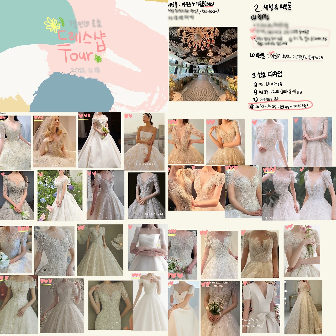 플래너님이 추천해 주신 샵 2곳과 내가 가고 싶었던 샵 2곳으로 드레스투어 일정을 짰다. 찾아보니 가장 가고 싶은 곳(시그니처엘리자베스)을 마지막에 배치하라고 해서 그렇게 순서를 말씀드렸으나, 플래너님이 예약해 주신 순서는 좀 달랐다. 가장 가고 싶은 샵을 가장 첫 순서로 배치해 주셨다. 아마 소요시간 등을 고려해 주신 게 아닌가 싶은데, 그럼에도 아직도 그때 왜 바꿔달라고 말을 못 했나 싶다.(결혼 준비는 모든 게 처음이라 그런 순간이 참 많다. 말없이 전문가 말을 들을 때가 더 나을 때도 있고 케바케).