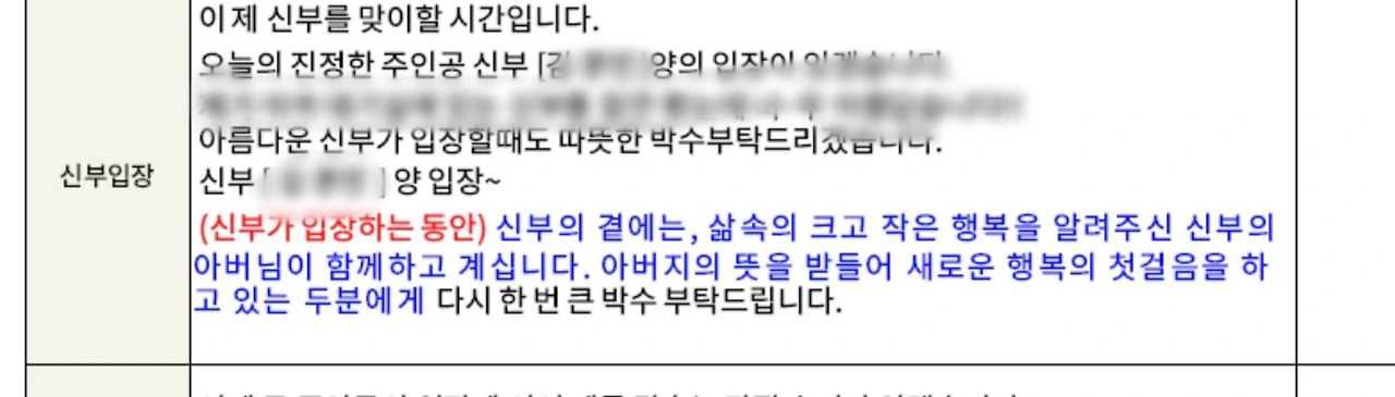 아빠에게도 예식장에도 그런 의사를 전했고, 나는 아빠의 손을 잡고 입장하여 아빠는 신랑을 포옹하고 나를 포옹한 뒤 착석하시고 나는 신랑의 손을 잡고 앞으로 나아갔다.
