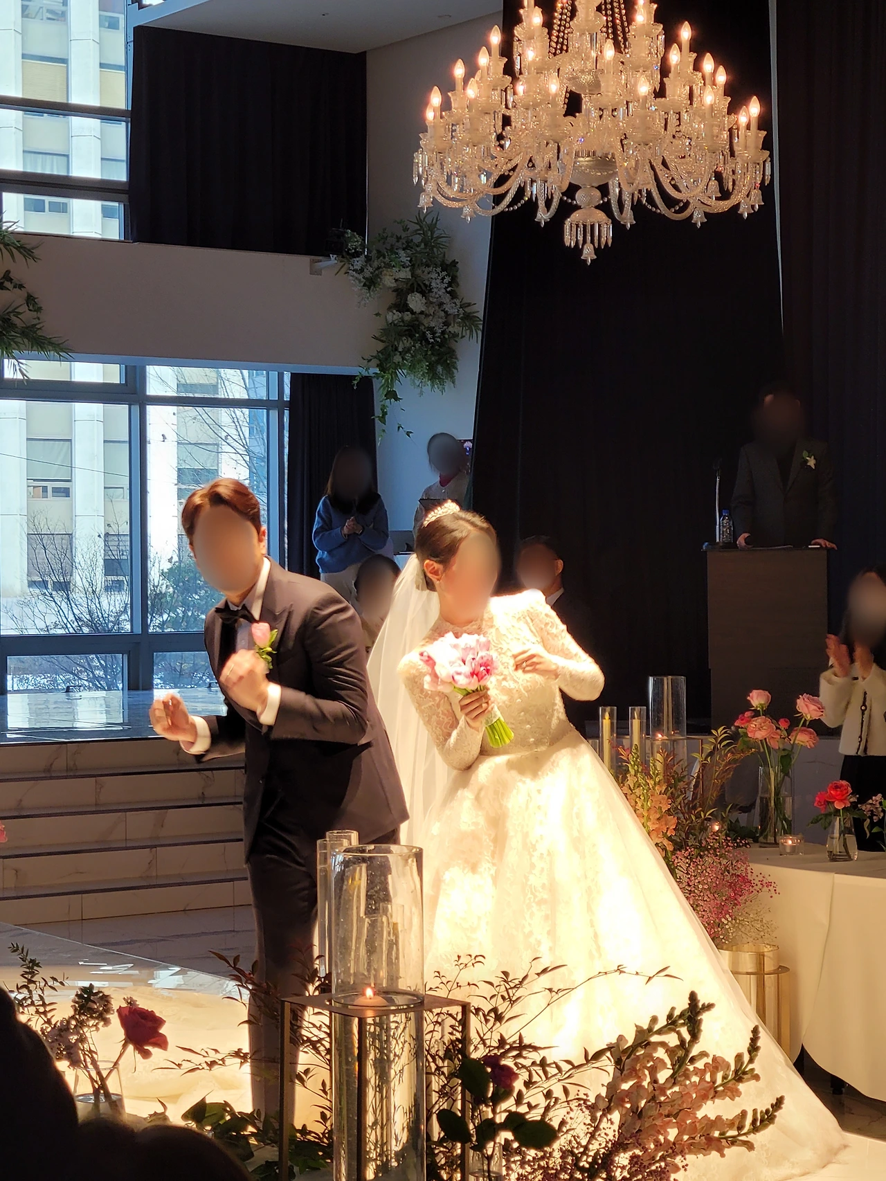 실제로는 누가 들어오고 나가고 정신없이 있다 보니 정신없이 입장하고 정신없이 끝나서 ‘인형처럼 앉아만 있는 신부’ 같은 비판의식 가질 틈도 없었다. 심지어 첫 예식이라 직원보다도 빨리 식장에 도착했음에도 여전히 바쁘고 정신없는 것이 결혼식