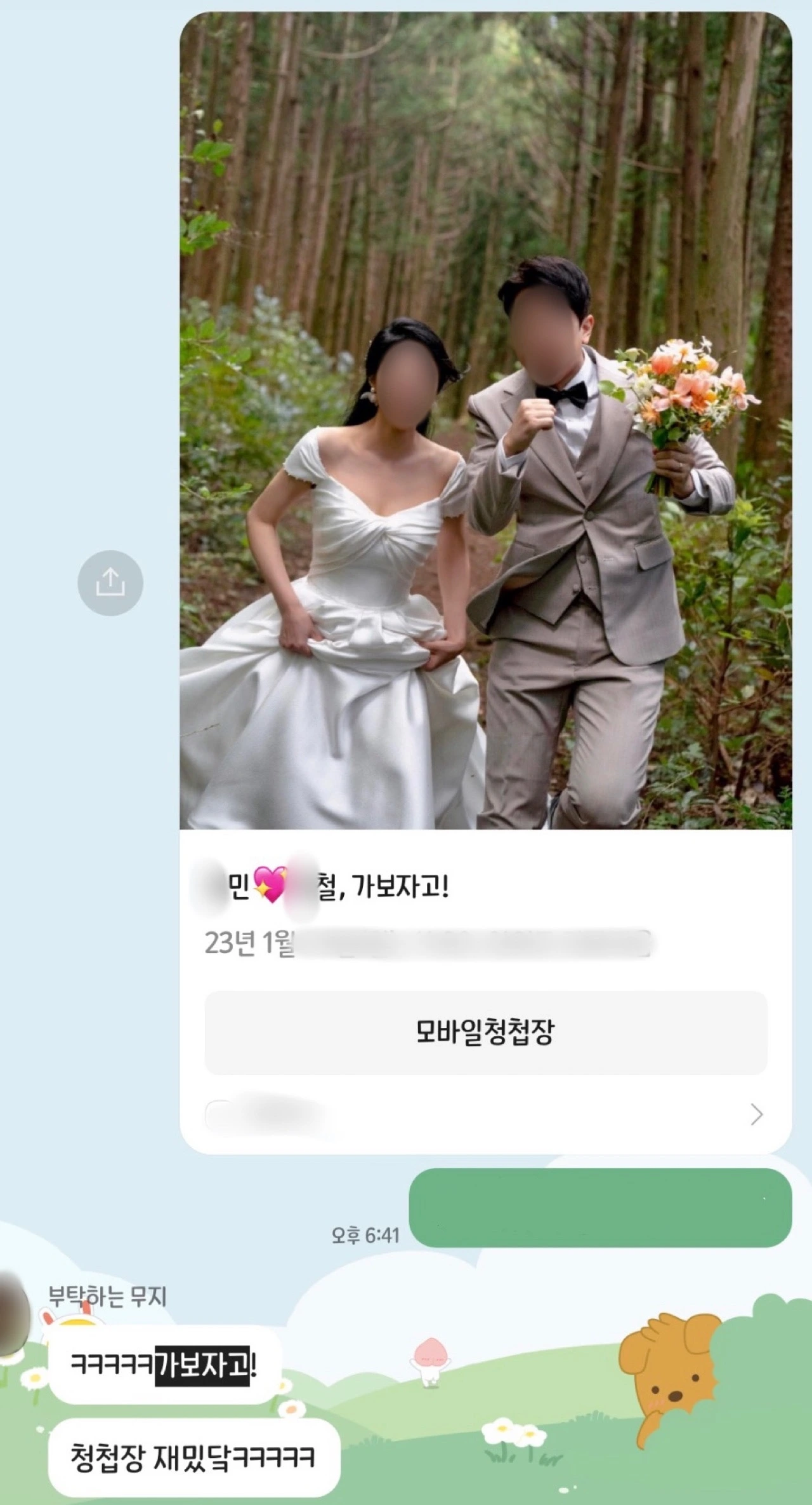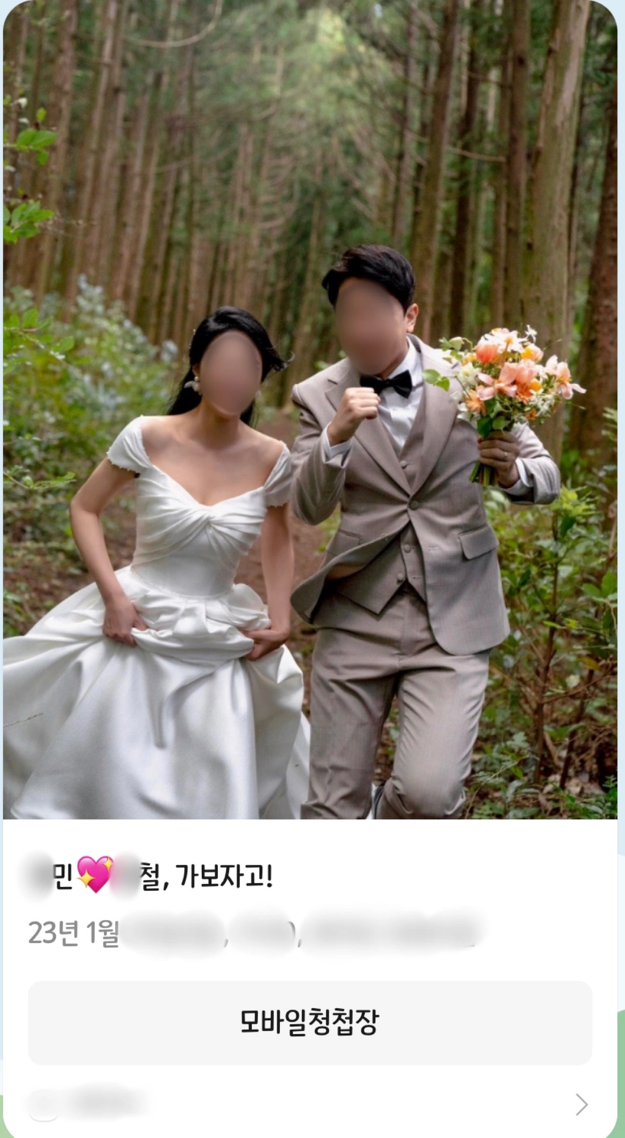 별도로 모청 제목도 “***, *** 결혼합니다” 문구가 뻔한 듯하여 사진에 맞추어 “***,**** 가보자고!”라고 써보았다.