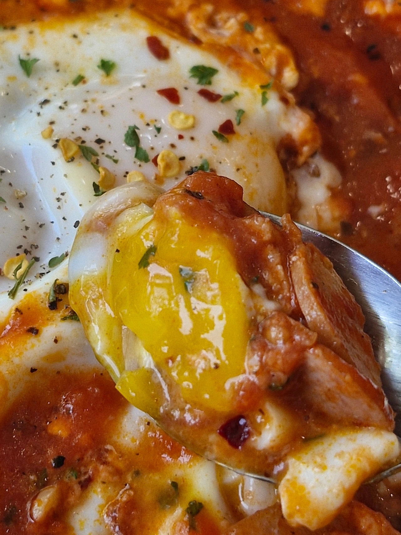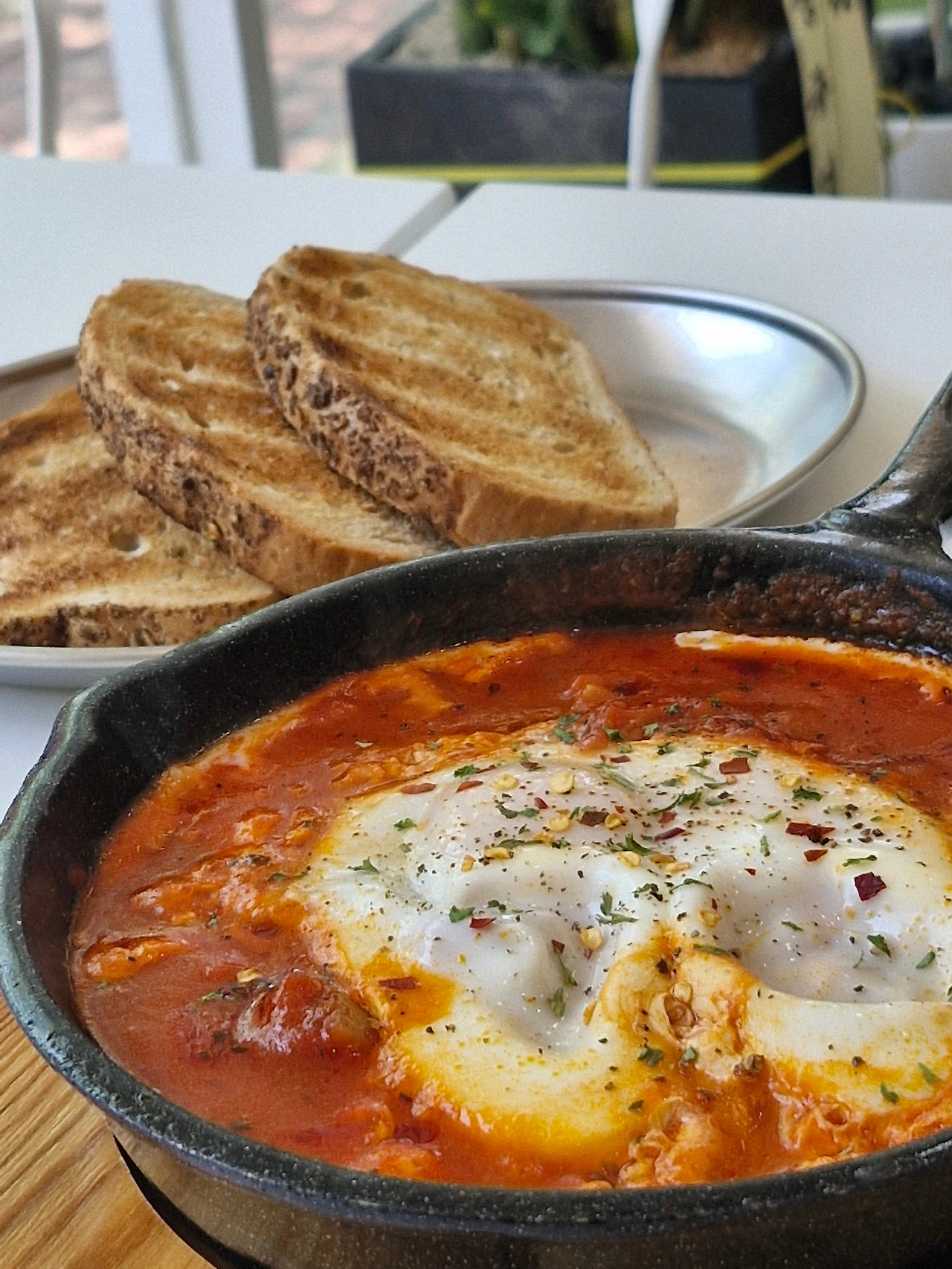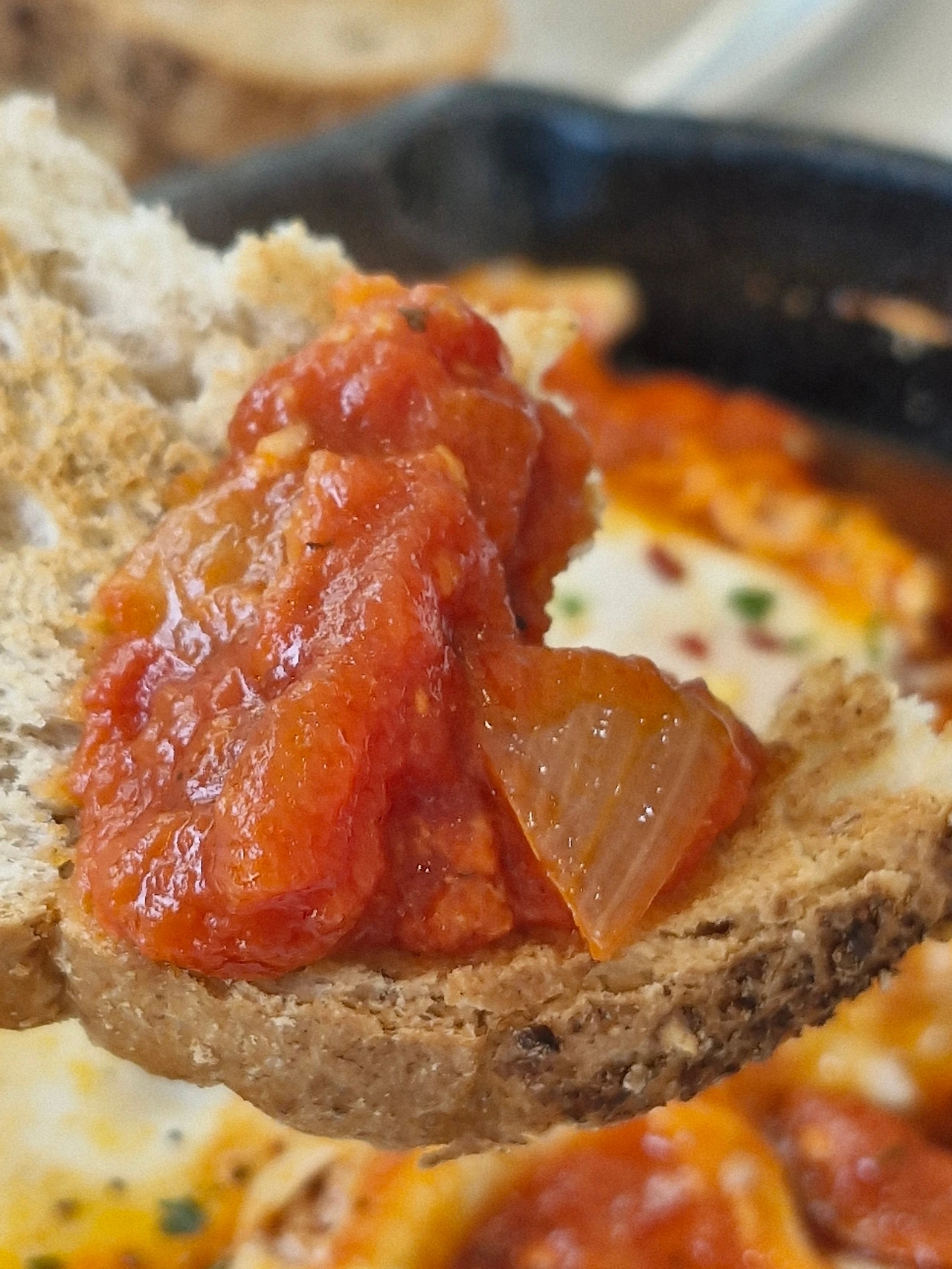 Egg in Hell이라는 이름은 요리의 비주얼을 보면 왜 그런 이름을 갖게 되었는지 바로 알아차릴 수 있다. 붉은 토마토 소스는 지옥의 불길을 연상시키고, 그 위에 둥둥 떠 있는 계란이 마치 지옥에 빠진 계란을 떠올리게 한다. 실제로 처음 이 요리를 접했을 때 이보다 잘 어울리는 이름은 없을 거라며 감탄했다.