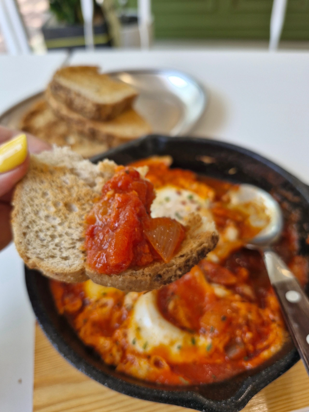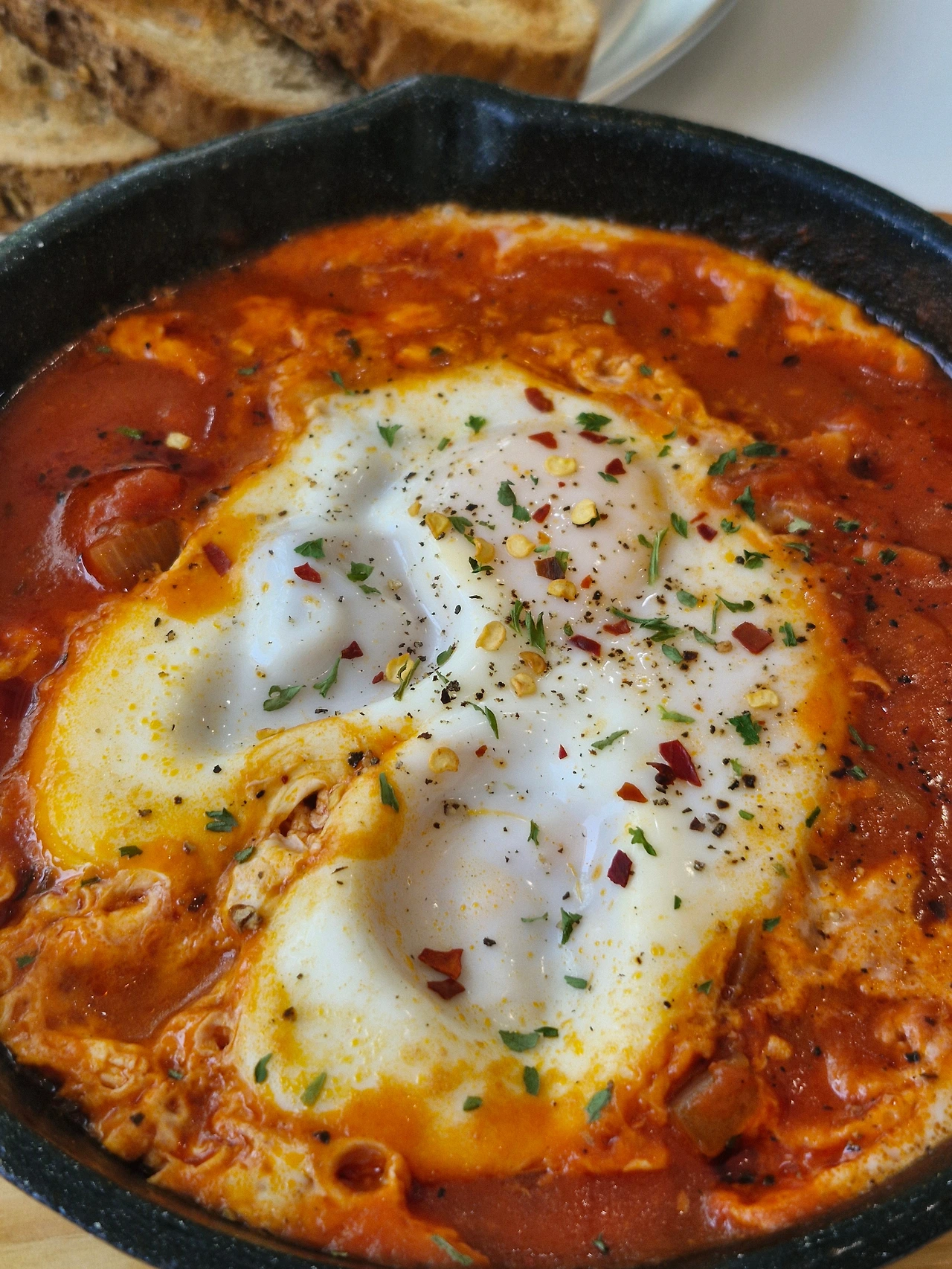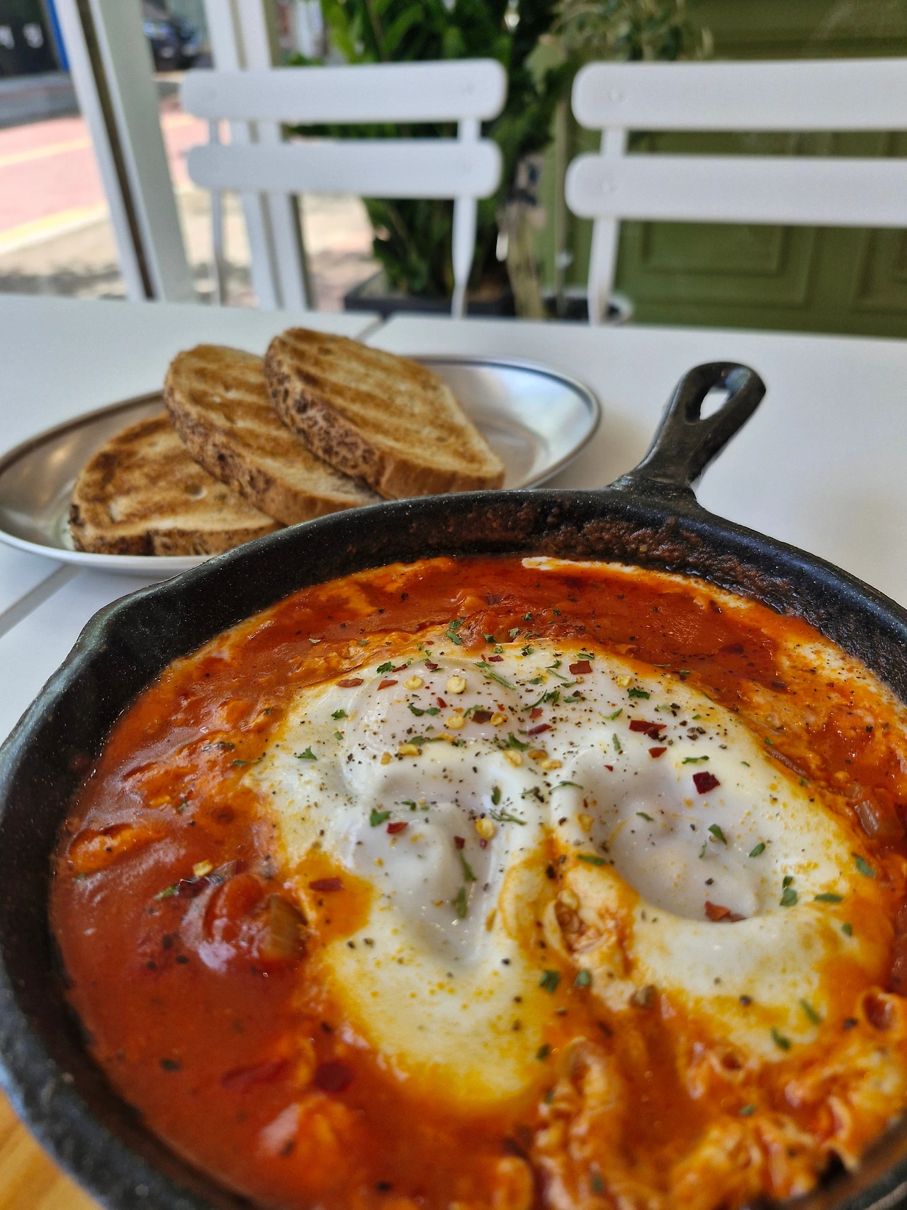 Egg in Hell이라는 이름은 요리의 비주얼을 보면 왜 그런 이름을 갖게 되었는지 바로 알아차릴 수 있다. 붉은 토마토 소스는 지옥의 불길을 연상시키고, 그 위에 둥둥 떠 있는 계란이 마치 지옥에 빠진 계란을 떠올리게 한다. 실제로 처음 이 요리를 접했을 때 이보다 잘 어울리는 이름은 없을 거라며 감탄했다.