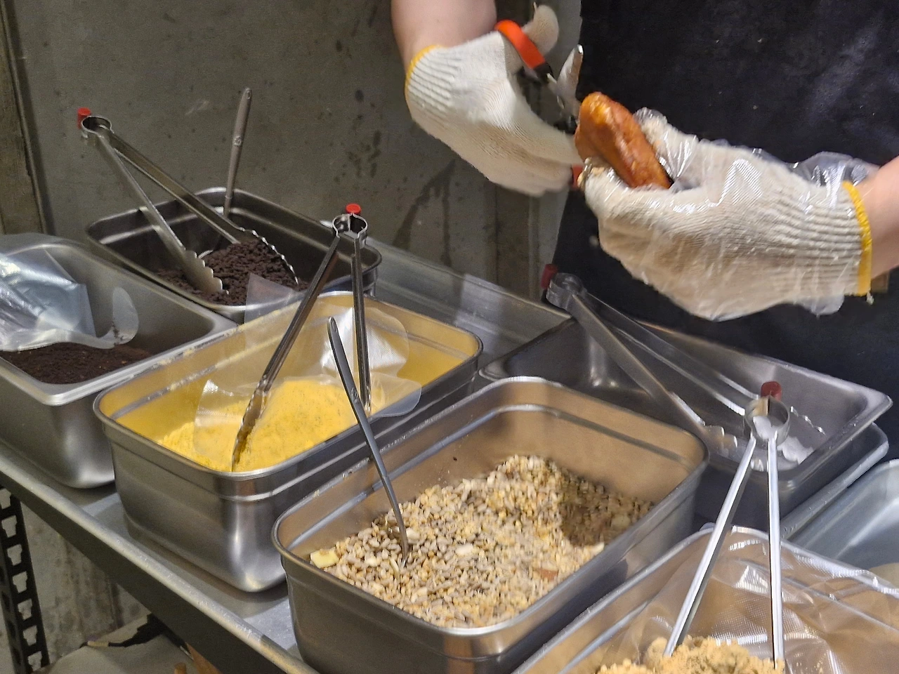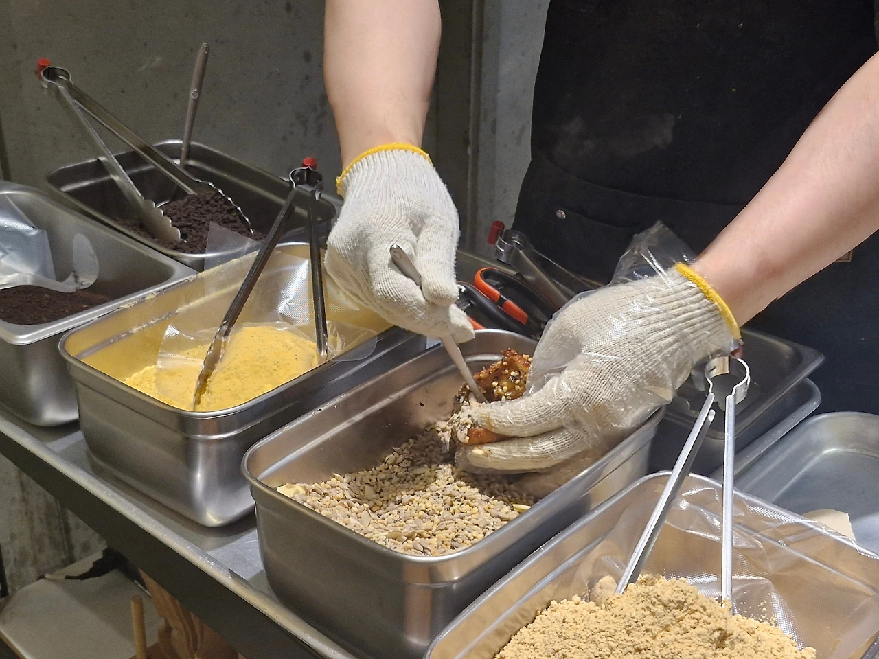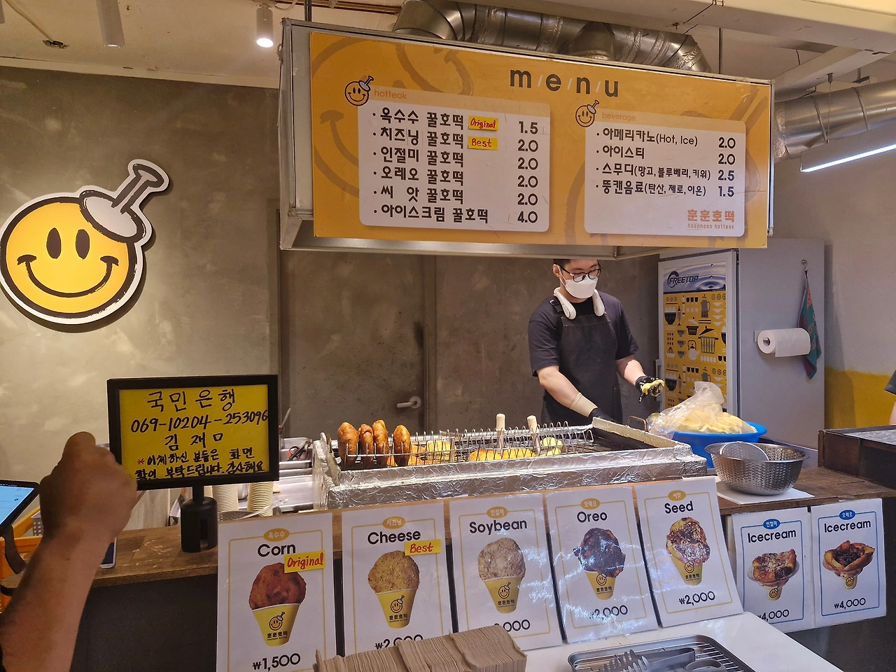 아주 잠시, 오레오, 치즈닝 등 현대적인 입맛의 호떡에 유혹당했다. 하지만 내가 요즘 계속 생각했던 건 바로 씨앗 꿀호떡. 오픈시간에 맞춰 가게를 찾아가니 슬슬 줄을 서기 시작했다. 다행히 길진 않아서 몇 분 기다렸다가 입장. 만들어놓은 호떡을 가위로 잘라 그 안에 씨앗을 마구 담아준다. 그 정도가 어느 정도냐면..