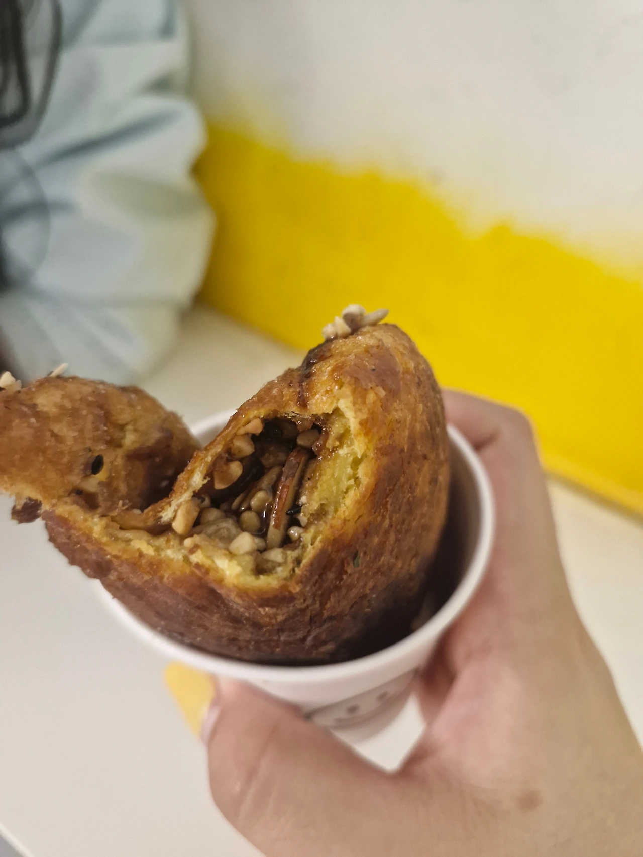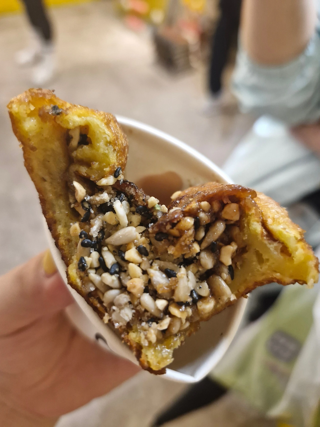 입구를 배어물 때부터 많은 것 같다 했는데, 중간쯤 되니 씨앗이 이만큼이나 들어있다. 중간중간 설탕 같은 달달한 맛도 씹힌다. 이미 꿀이 발라져 있는 상태여서 여기에 씨앗과 설탕 같은 입자가 더해지니 달달함이 두 배다. 오리지널을 선택한 친구는 너무 달다고 했지만, 나는 씹히는 식감의 씨앗을 같이 먹어서 그런지 아님 그냥 내 입맛 자체가 달달함을 좋아해서인지 맛있게 잘 먹었다. 겨울 하면 생각나는 대표적인 간식이 호떡인데 근래 들어선 맛있는 호떡을 찾아보기가 참 힘들다. 그런데 이 집은 진짜, 정말 맛있었다. 튀김도 너무 기름지지 않으면서 바삭했고, 달달한 맛이 호떡 안 쪽에 스며들어 있어서 꿀이 새는 느낌이 아니라 튀김옷에 배어있는 달달함이었다. 호떡을 먹다 보면 안에 있는 꿀이랄까, 설탕시럽이랄까, 어쨌든 달달한 액체가 튀어나와 여기저기 묻기 마련인데, 이 호떡은 그렇지 않았다는 의미이다. (대신 씨앗이 넘쳐흐르긴 했다..!)