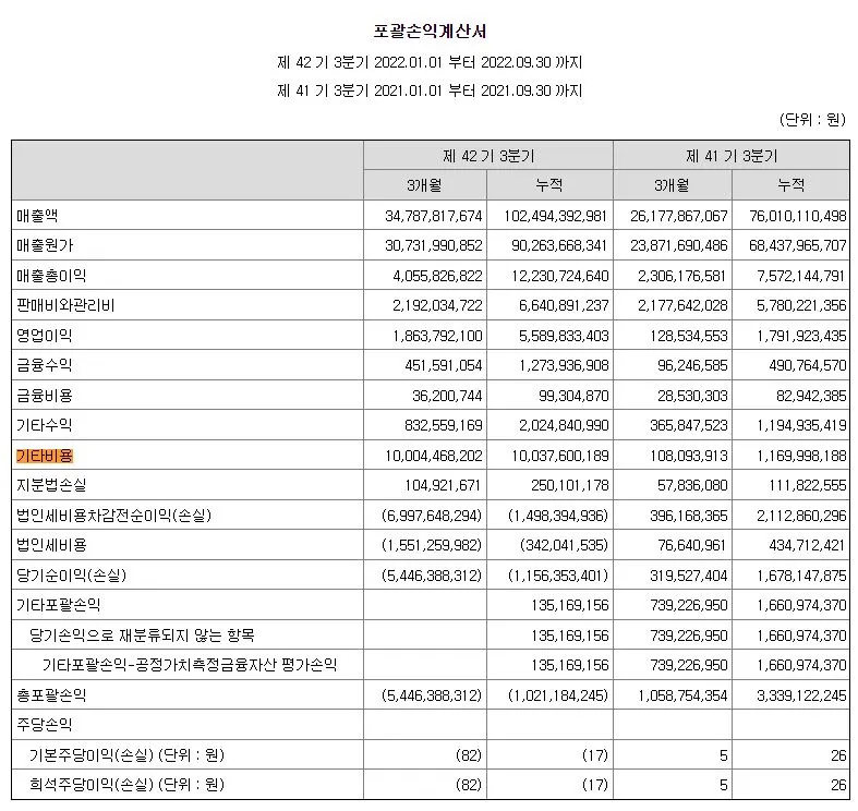 하지만 이러한 양호한 영업실적에도 불구하고 3/4분기 마지막 날인 9월 30일에 우발적으로 발생한 폭발/화재사고로 인해 100억원에 달하는 기타비용(영업외비용)이 회계적으로 인식됨에 따라 결과적으로 당기순손실이 발생하여 적자전환했음을 알 수 있습니다.