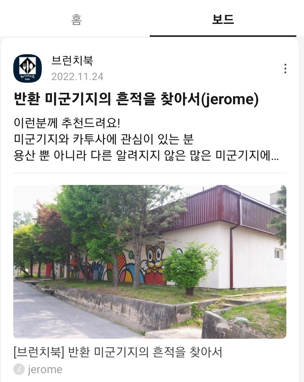 옛 미군기지의 흔적을 찾아 이를 기록으로 남기는 훌륭한 작업을 하고 계시네요. 저도 제가 복무했던 대대의 흔적을 web을 통해 알아보고 있고, 일부는 직접 답사하기도 했던 터라 후배님의 노력의 결과물을 보니 감사와 존경의 마음이 듭니다. 언제 직접 뵐 기회를 기대합니다. 건강하십시오. - 카투사연합회 유*경