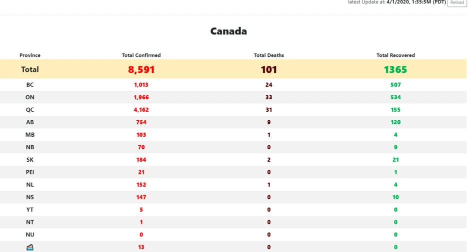 금일 (4/1) 기준 캐나다 코로나 확진자 수는 총 8천5백여 명인데 그중 내가 속한 퀘벡 주는 무려 절반인 4천여 명으로 분위기가 엄청 살벌하다.