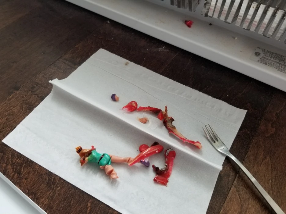 둘째가 장난감을 몰래 집어넣기 때문이다. 이렇게 빼내 줘야지 냄새가 멈춘다.