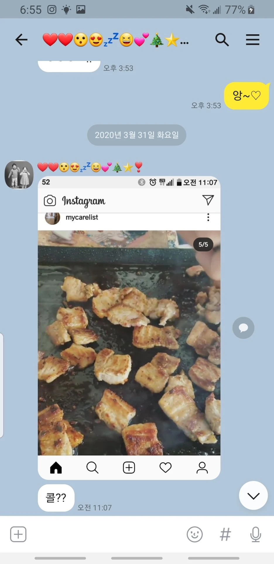 오늘 온 남편의 단골 카톡 멘트. (삼겹살 콜?) 나는 혈관 건강을 생각해서 가능한 육류를 멀리하려고 노력하는데 생로병사의 비밀 - 비만 편을 보고 있으면서도 갑자기 삼겹살이 먹고 싶다는 삼겹살 마니아다.