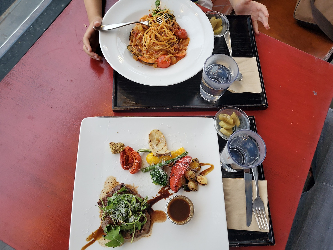 나는 가장 전망 좋은 자리를 찾기 위해 남편에게 주문을 맡긴 다음 매의 눈을 부릅뜨고 카페 구석구석을 살피다가 제일 마음에 드는 테이블에 앉았는데, 한참 뒤에 남편이 파스타 대신 스테이크가 담긴 접시를 들고 오는 게 아닌가! 메뉴판을 다시 확인하니 그 집에서 가장 비싼 메뉴였다.