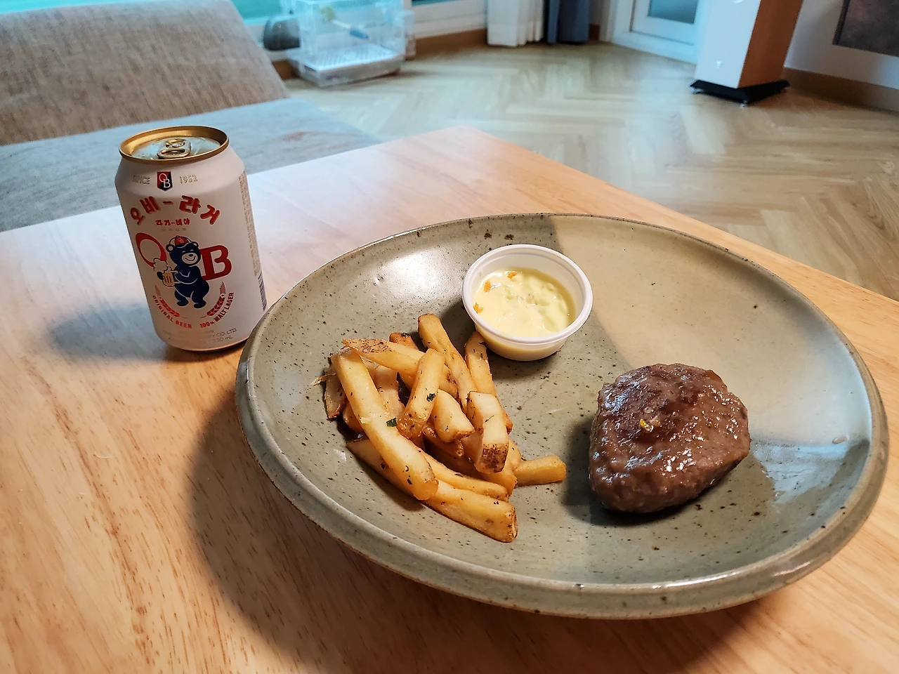 스테이크까지 그릇에 옮겨 담고 거실 탁자에 자리를 잡은 다음 맥주캔을 딸깍! 열고 한 입 마셨다. 차갑고 알싸한 청량감이 목구멍을 타고 넘어갔다. 얼른 햄버거 스테이크를 한 입 깨물자 입 안 가득 육즙이 흘러들어왔다. 으음... 죽인다. 화이트 소스에 찍은 감자튀김도 한 입. 고소한 기름맛과 소스의 감칠맛이 잘 어우러졌다.