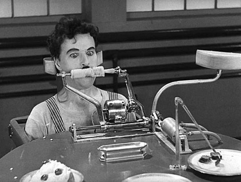경영자의 횡포는 더더욱 심해집니다. 컨베이어 벨트의 속도는 올리는 건 약과입니다. 그는 '벨로우즈 급식기'라는 신문물을 도입하려고 하죠. 사진에서 알 수 있듯 채플린은 옴쌀달짝 못하고 앉아 기계가 퍼주는대로 먹어야 합니다.