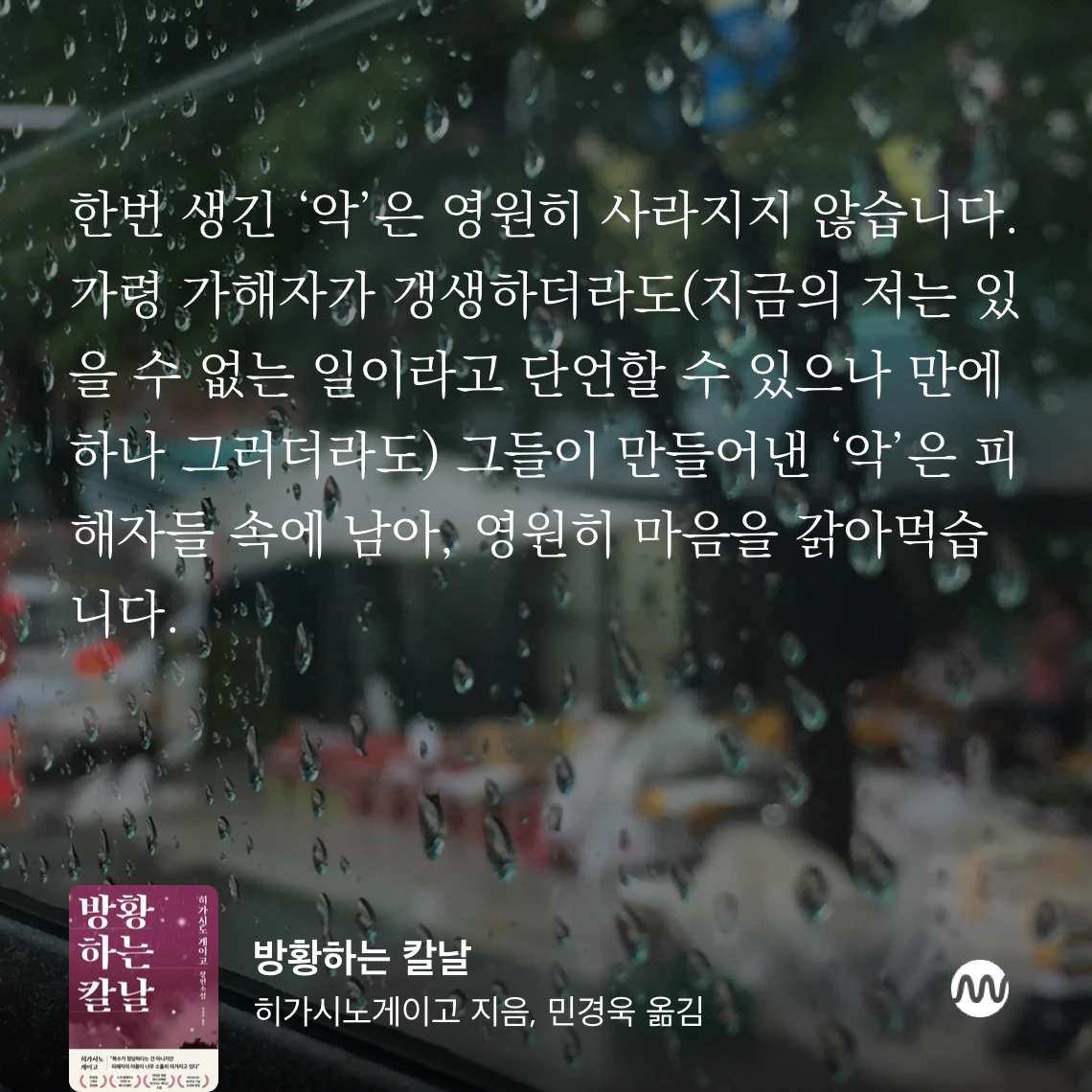 이 소설은 일본에서 2004년 출간되었다. 시간이 많이 흘렀지만 히가시노 게이고 소설의 흡입력은 여전했다. 나는 소설 속으로 빨려 들어가 경찰이 되기도 했다가, 에마의 아버지가 되기도 했다. 슬퍼하고 분노하고 좌절하고 잠시 희망을 보기도 했다. 소설을 읽으며 지난 몇 년간 한국에서도 큰 화두였던 소년법과 n번방 사건 같은 일들이 계속 떠올랐다. 주목받던 사건들도 법원의 판결은 늘 너무 가볍게만 느껴진다. 시간이 많이 흘러도 해결되지 않는 질문이 가득하다. 판사가 판결한 형량을 채우면 죄악은 없어지는 것인가. 소년법은 처벌을 위한 것인가, 아니면 갱생을 위한 것인가. 갱생은 어떻게 완성되는가. 경찰이 수호하는 것은 정의인가 법률인가. 피해자와 남겨진 사람들의 입장에서 이 질문을 받으면 비교적 명확하게 대답할 수 있을 것이다.