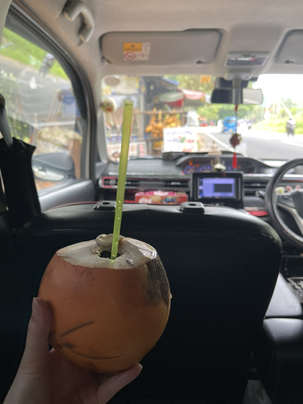 다시 고속도로에서 나와 가로수가 멋지게 드리워진 국도를 달렸다. 그러다 갑자기 유턴했다. 이건 또 무슨 일인지 생각했는데 갑자기 차에서 내렸다. 나는 뒷자리에 앉아서 무슨 일인지 생각하고 있었는데, 듀란은 코코넛을 샀다. 길거리에서 파는 코코넛은 많이 봤는데 동남아에서 먹는 코코넛과 약간 다르게 생겼다. 그 자리에서 바로 뚜껑을 따고(?) 작은 구멍을 만들어 빨대를 꽂아주었다. 그리고 뒷자리 문을 열어 나에게 코코넛을 쥐여줬다. 알고 보니 담배를 필 시간이 필요했던 거다. ㅋㅋㅋ 안에 코코넛 주스를 다 마시고 나면 그걸 반으로 나눠주면서 속살을 퍼먹을 수 있게 껍질로 숟가락을 만들어준다. 이런 색다른 경험이라니. 이게 여행의 맛이다.
