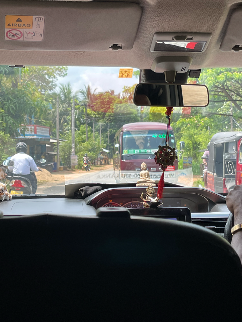 콜롬보 공항에서 시기리야에 올 때 만난 기사님인 Dulan이 아침에 오기로 했는데 늦었다. 아침 일찍 출발해서 오후에는 누와라엘리야에서 시간을 보내고 싶었는데 10시가 다 되어서 왔다. 뒷자리 한쪽에는 내 배낭이 안전벨트를 매고, 또 다른 쪽에는 내가 앉았다. 조수석 머리 받침대를 뽑아주어서 달리는 길이 잘 보였다. 가는 길에 담불라 황금사원에 들려 금빛 부처님과 급하게 사진도 찍었다.