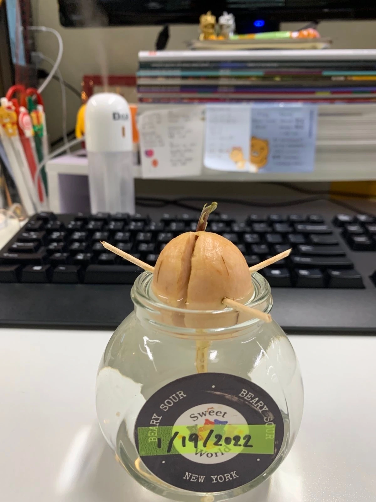 아직 상표와 성분표가 덕지덕지 붙은 요거트 유리병을 깨끗하게 씻고 미지근한 물을 담았다. 아보카도 씨앗이 빠지지 않도록 이쑤시개 3개를 씨앗 바깥쪽으로 꽂고 물이 가득 찬 유리병 위에 올려두었다. 초등학교 때 방울토마토를 키우며 관찰일지를 썼던 후로 싹을 틔워서 무언가를 키우는 것은 처음이다. 언제쯤 되면 파란 잎이 날까 기다려진다. 꼭 초등학생으로 돌아간 것처럼.
