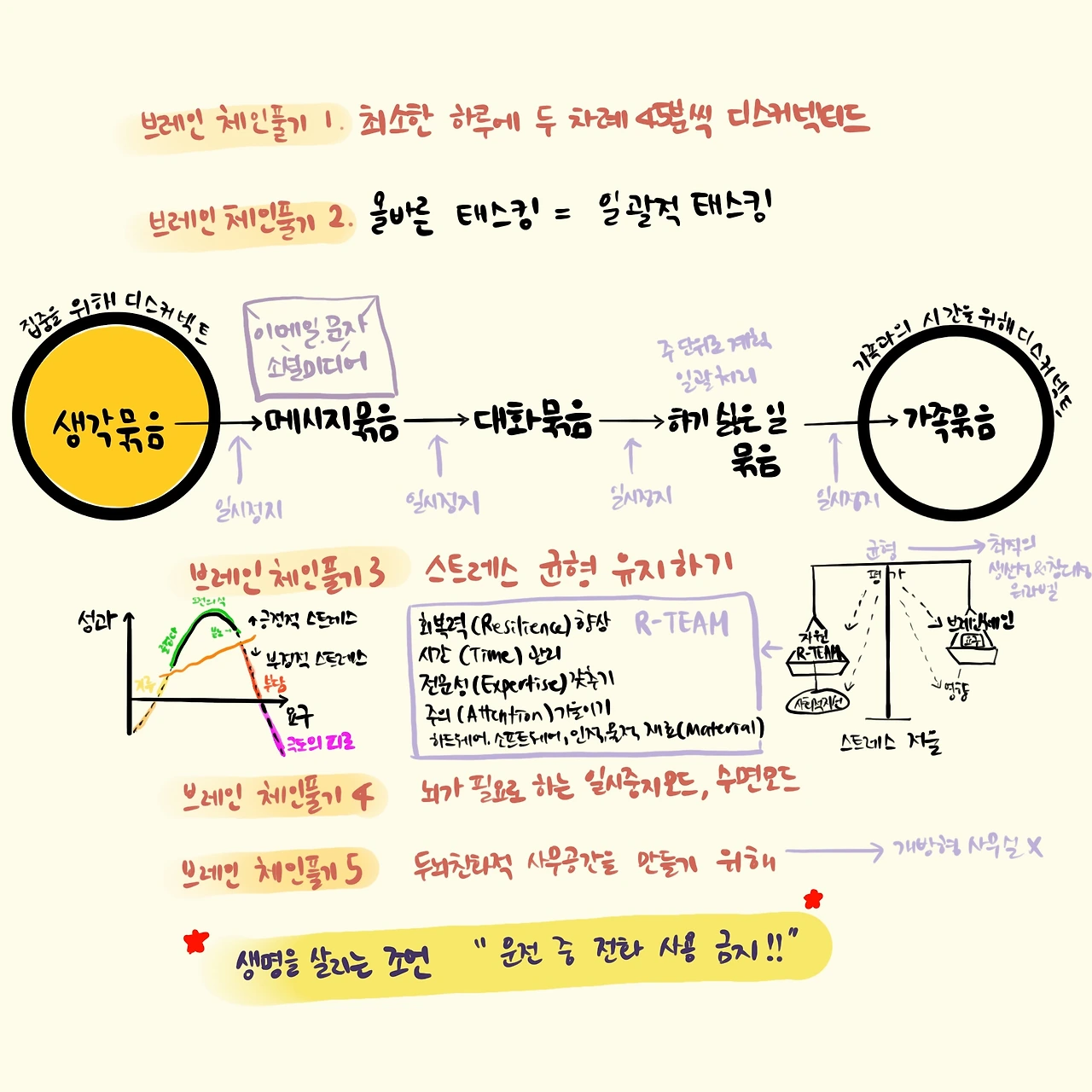 이 책은 신경정신과 의사이자 심리치료사, 비즈니스 컨설턴트인 테오 컴퍼놀이 몇 년 앞서 쓴 <브레인 체인 Brain Chain>의 핵심내용을 간추려 발표한 것이다. 초연결 사회를 살아가는 사람들에게 뇌를 어떻게 활용해야 하는지 간략하게 알려주는 가이드북 같은 느낌이다. 뇌와 정보통신기술(ICT) 사이의 시너지를 유도해서 지적 생산성과 창의성을 높이고 스트레스를 줄일 수 있는 방법에 대해 이야기한다. 매 챕터 내용을 한두 문장으로 요약해 두고, 삽화나 인포그래픽이 적절하게 들어있어 아주 쉽고 빠르게 읽을 수 있다. 아무래도 원래 출간되었던 책을 요약해 만든 책이라 핵심만 담겨있고, 더 깊이 있는 내용으로 나아가지는 않는다.