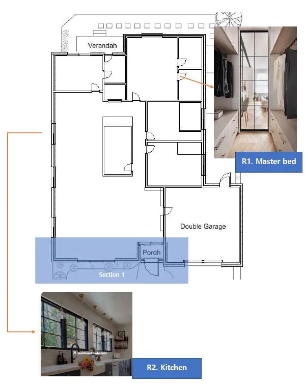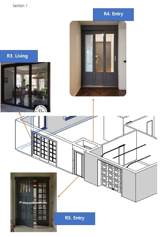 2. 건설사 없이 레노베이션을 진행하려면 직접 타일, 배관, 벽, 페인트, 전기, 창문, 바닥, 에어컨 업체들을 하나씩 하나씩 불러서 작업을 조율해야 한다. 회사에 함께 일하는 업체들과 구글에서 찾아낸 업체들에 쭉 한번 전화를 돌렸다. 혹시나 '어림잡아 만든' 가견적이라도 줄까 싶어, 공종별로 서너 페이지 분량의 견적 요청서도 만들었다. 두루뭉술하게 완성된 평면도에 치수를 넣었고, 섹션별로 번호를 매겨 참조할만한 이미지들을 넣었다.