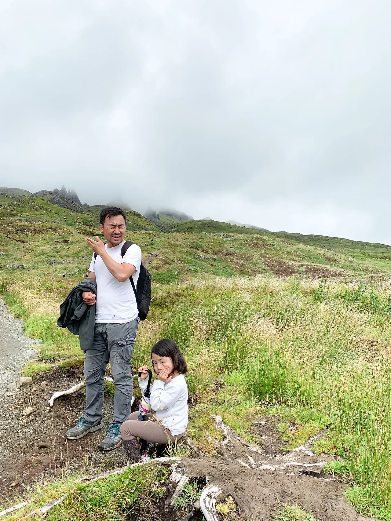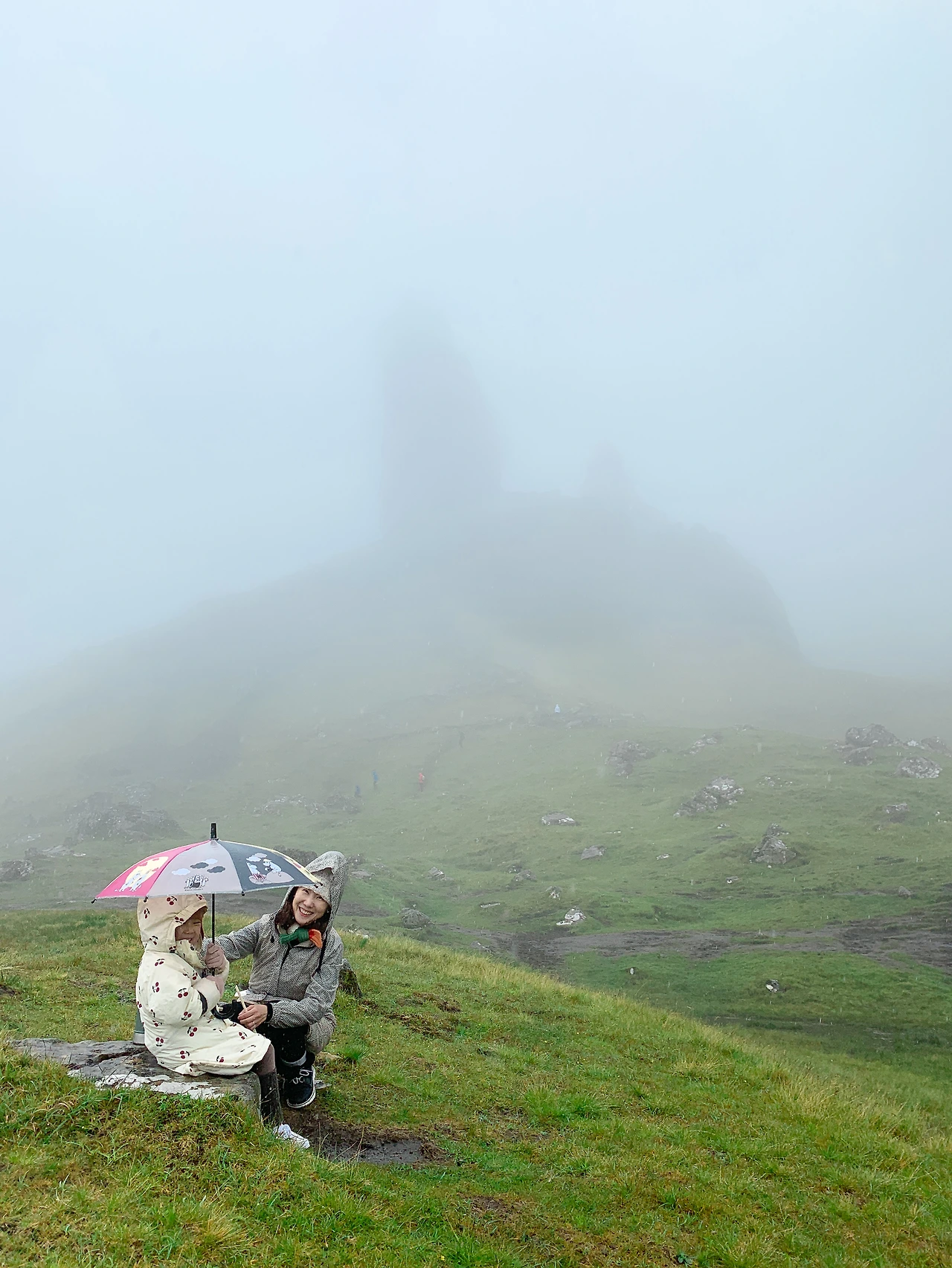 신선이 산다는 곳, 올드 맨 오브 스토르(The Old Man of Storr)가 스카이 섬의 핵심 중 하나인데 날씨가 계속 흐리다. 정상에 올라가면 괜찮지 않을까 하는 기대감을 갖고 올라가 보지만 비바람은 심해지고 곤충습격(Highland midge: 스코틀랜드 곤충)까지 받으니 중간에 포기하고 싶은 마음이 가득했다. '이게 무슨 여행이야, 고행이지!'라는 생각뿐, 엘라 역시 옆에서 투덜거리느라 입이 코만큼 나왔다.
