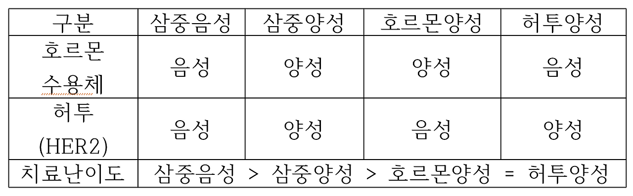 호르몬 양성 유방암, HER2 양성 유방암, 삼중 음성 유방암 중 호르몬 양성 유방암이 가장 순한 암이며 예후가 좋고 천천히 자라난다. 반대로 HER2 양성 유방암과 삼중 음성 유방암은 상당히 독한 편에 속하기 때문에 암이 빠르게 자라난다. 따라서 항암치료를 하면 암이 잘 줄어든다.