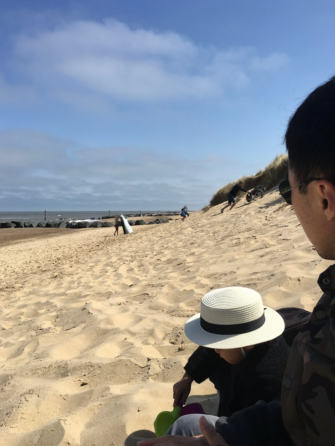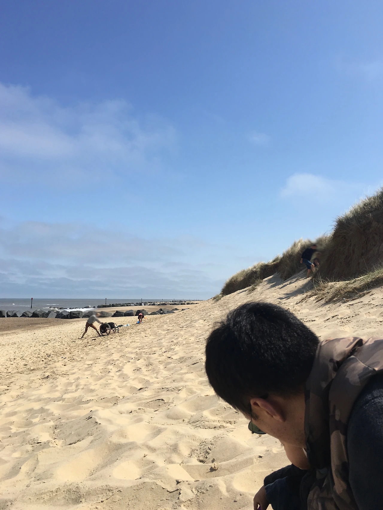 한두 시간 후, 가족이 짐을 챙긴다. 초등학생으로 보이던 딸과 아들은 돗자리 위에 쌓여있던 짐을 같이 정리한다. 자기네들 키보다 훨씬 큰 돗자리 모래를 팍팍 털면서. (너무 빨리 철들어버린 모습에 안타까운 마음도 들었다.) 그 시간 아빠는 아내를 업고 모래사장 언덕을 힘겹게 올라간 후, 다시 휠체어를 언덕 위로 올려놓는다. 어떤 이유로 이렇게 되었는지 모르겠지만, 함께 돕던 가족의 모습은 어떤 가족보다 단단해 보였고, 아름다웠다.