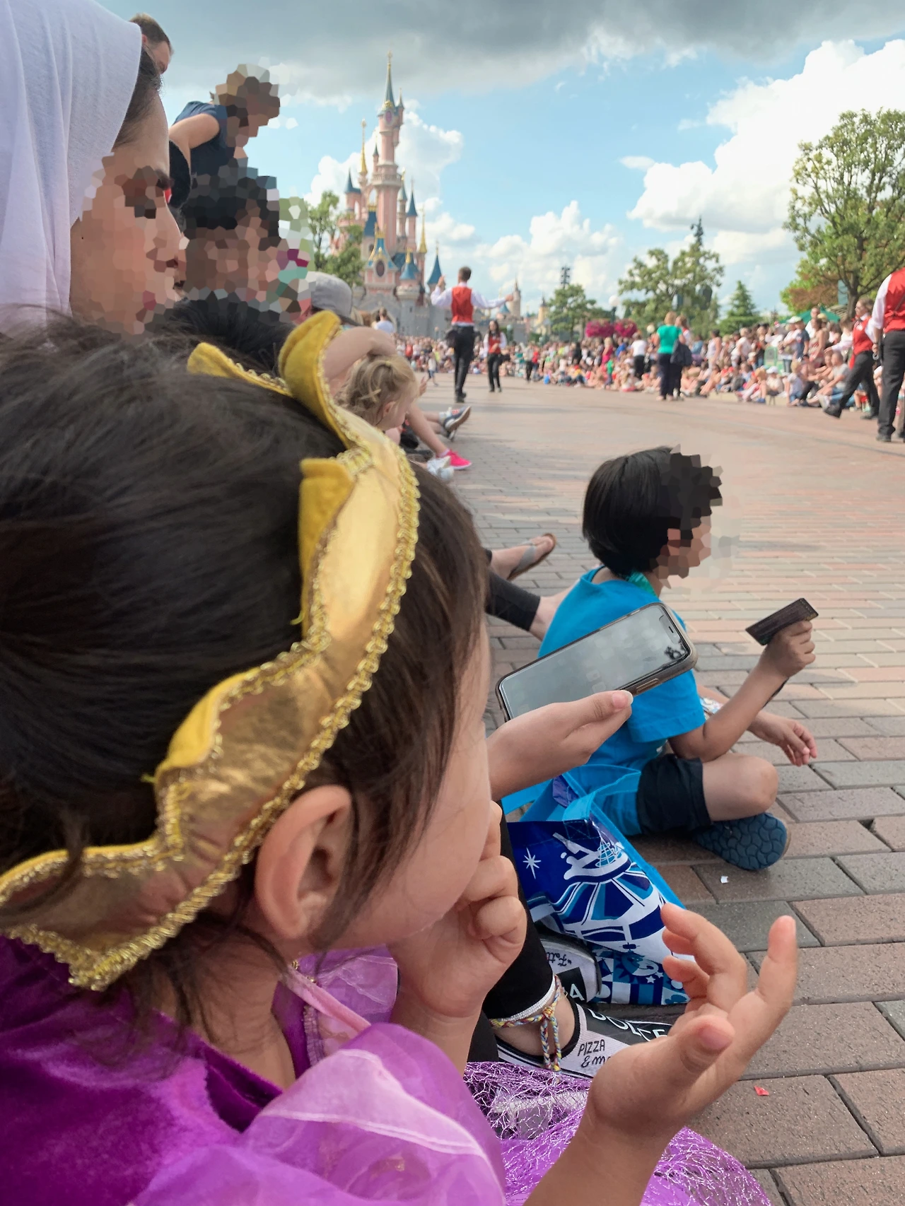 딸이 그토록 보고 싶어 했던 퍼레이드를 보기 위해, 한 시간 반부터 바닥에 자리를 잡고 기다렸다. 시작하기 10분 전, 히잡을 쓴 여인이 엘라 옆 쇼핑백 둔 곳을 가리키며 앉아도 되겠냐고 물었다. (대체로 뒤늦게 온 사람들은 뒷자리로 가서 서서 보는 편) 불편하게 보더라도 좋은 게 좋은 거라고 생각해 승낙했다. 그런데 뒤에 딸, 아들까지 (어디선가) 데리고 와 바닥에 앉히자 엘라 자리가 반으로 줄어들었다(가부좌 자세로 앉다가 무릎을 불편하게 세워야 겨우 앉을 수 있는 상황).