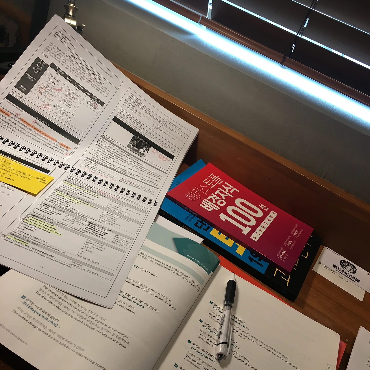 함께 이용하는 사람들은 예닐곱 명 정도. 중고생들도 있었지만, 주로 엉덩이 떼지 않고 오래도록 집중력을 유지하는 쪽은 나와 같이 나이 좀 있는 언니들이었던 걸로 기억한다. 무슨 공부를 하는 걸까 궁금할 땐 서로 책상 위에 올려져 있는 문제집들을 흘낏흘낏 쳐다보곤 했는데 임용고시 준비생도 있었고 공무원준비를 하는 분도 있었다. 내 책상위에는 리스닝, 리딩 문제집 한 가득. (여기서 잠깐! 독서실에서는 옆 사람에게 방해될까봐 자판을 두드릴 수 없으니 롸이팅 모의 연습은 할 수 없고 스피킹을 위해 중얼중얼하는 것도 불가능함을 기억하자. 조용함이 100% 유지되어야 하는 공간에선 리스닝, 리딩이 최적이다, 반대로 스피킹 공부는 별다방 창가자리에 앉아 혼자 신들린 듯이 중얼중얼하는 게 최고)
