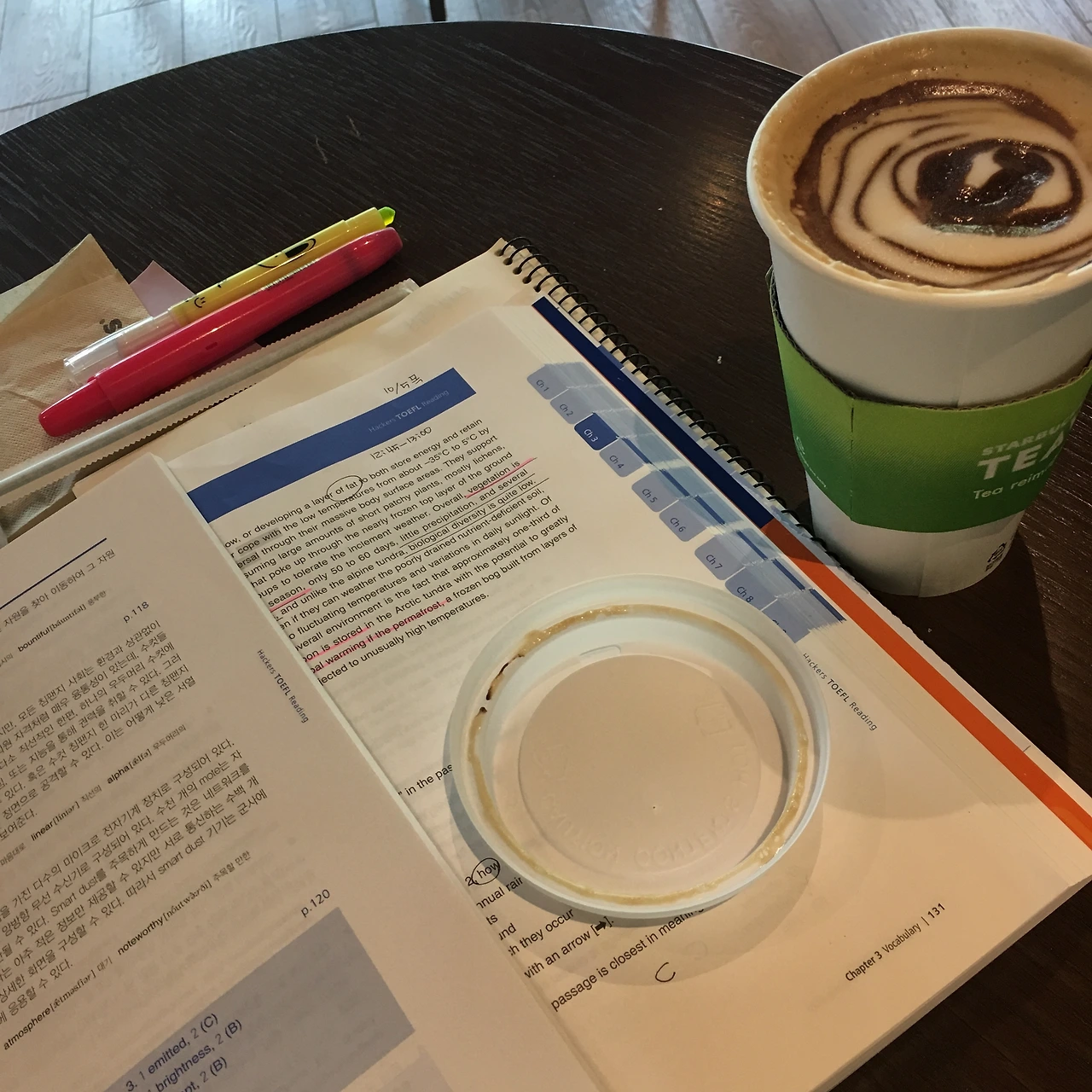 미국에 와서 생활하기 이전, 남편과 장난삼아 이런 이야기를 나눈 적이 있다. 워낙 좋은 카페들이 테마별로 많은 요즘이지만, 난 자칭 타칭 별다방 마니아. 무엇보다 공간이 널찍널찍한 매장이 많아서 공부하기 좋다는 게 큰 매력. 춘천지역에서 일을 처음 시작할 때는 대형 마트 안에 입점한 매장 하나, 도청 근처 매장 하나 정도가 전부였지만, 10여 년가까이 살면서 널찍한 평수를 자랑하는 매장이 꽤나 많이 생겼다. 오픈 시간에 맞춰 등교하듯이 입장하면 공부하기 좋은 단골 자리, 최대한 깊숙하게 그늘진, 구석자리는 늘 내꺼가 된다. 라디오 생방송 시간 전까지 주로 '리딩' 영역을 풀기 딱이다. 적당한 소음 속에서 읽는 훈련하기도 제격이다. 일단 회사에 머물면 틈새시간을 짜내서 공부할 수 있을 뿐이므로! 통으로 문제를 푸는 공부는 나만의 시간이 1시간이상 확보될 때, 방해 안 받을 수 있는 공간을 최선을 다해 pick할 것!