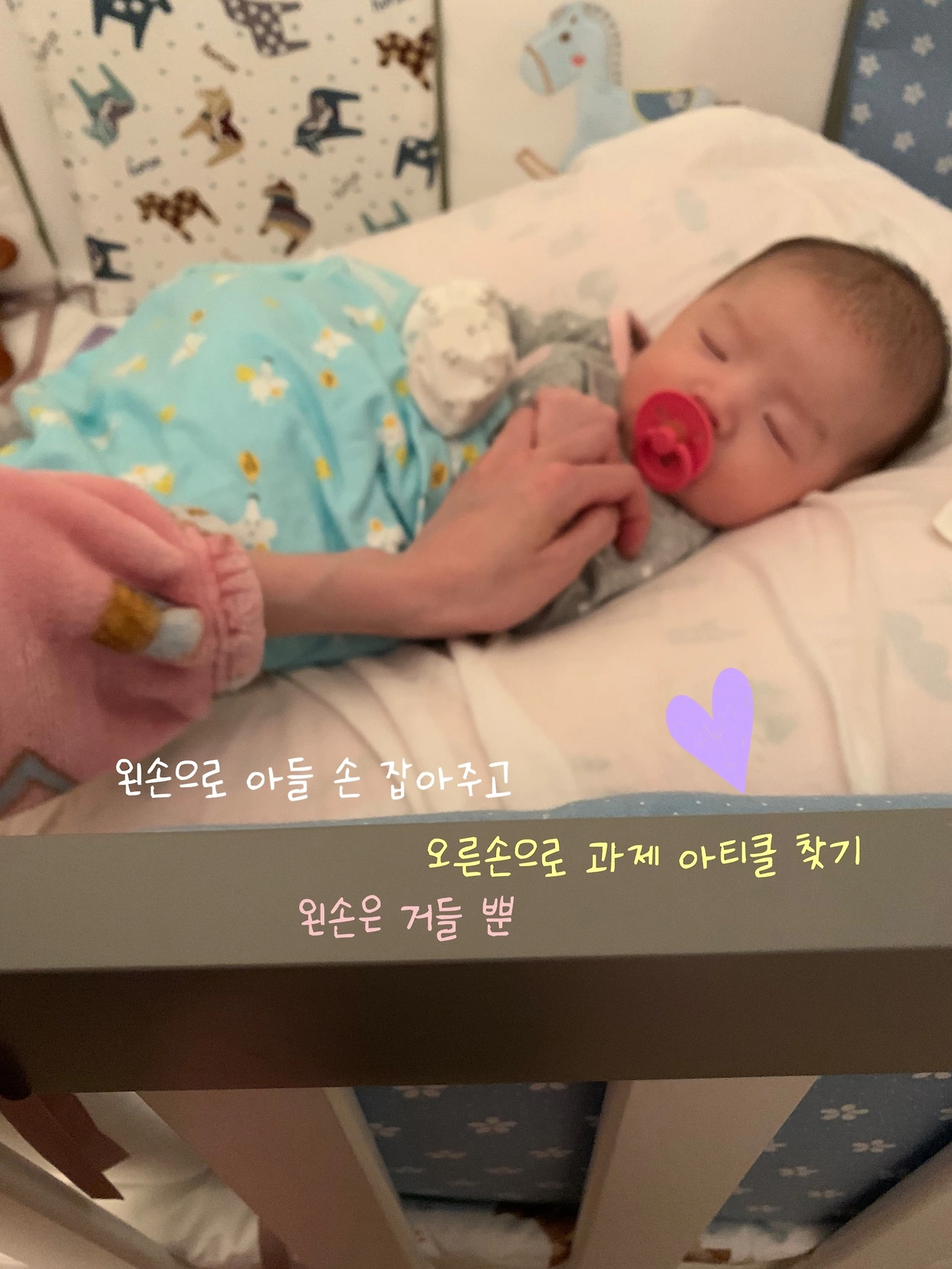 아들이 먼저 손을 건넨 건 처음이다. 태어난 직후, 아기의 손과 발이 마냥 신기해서 내가 먼저 만지작만지작 거린 적만 있었지. 아직 말 한마디 떼지 못한, 신생아 시기를 갓 넘긴 아기가 나를 붙잡다니. 이렇게 신기하고 감동적일 수가. 엄마의 손을 붙든 느낌이 좋았던 걸지, 아기 역시 붙든 손을 쉽게 놓지 않는다. 얼마나 꼬옥 붙잡았던 건지, 살살 돌려 몰래 손을 놓고 달아나려고 해도 불가능할 수준의 접착력이다. 이렇게나 엄마 손이 좋다는 건데 굳이 나도 '잠 좀 자겠다'고 억지로 그 접촉의 순간을 놓아둬버리고 싶지가 않다. 아기의 오른손과 내 왼손이 맞닿은 순간을 더 있는 힘껏 붙들고 싶어서 나도 모르게 내 손에 더 뜨겁게 힘을 주었다.